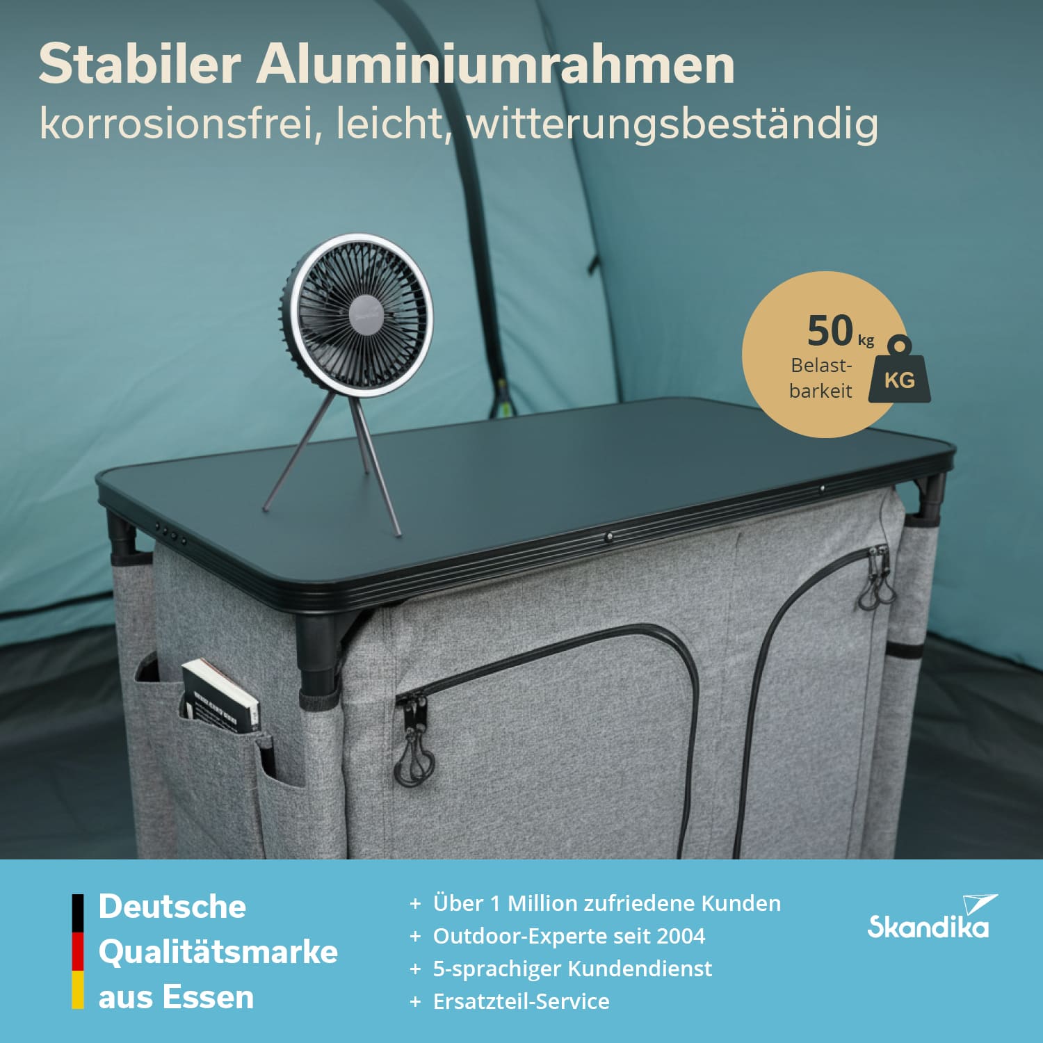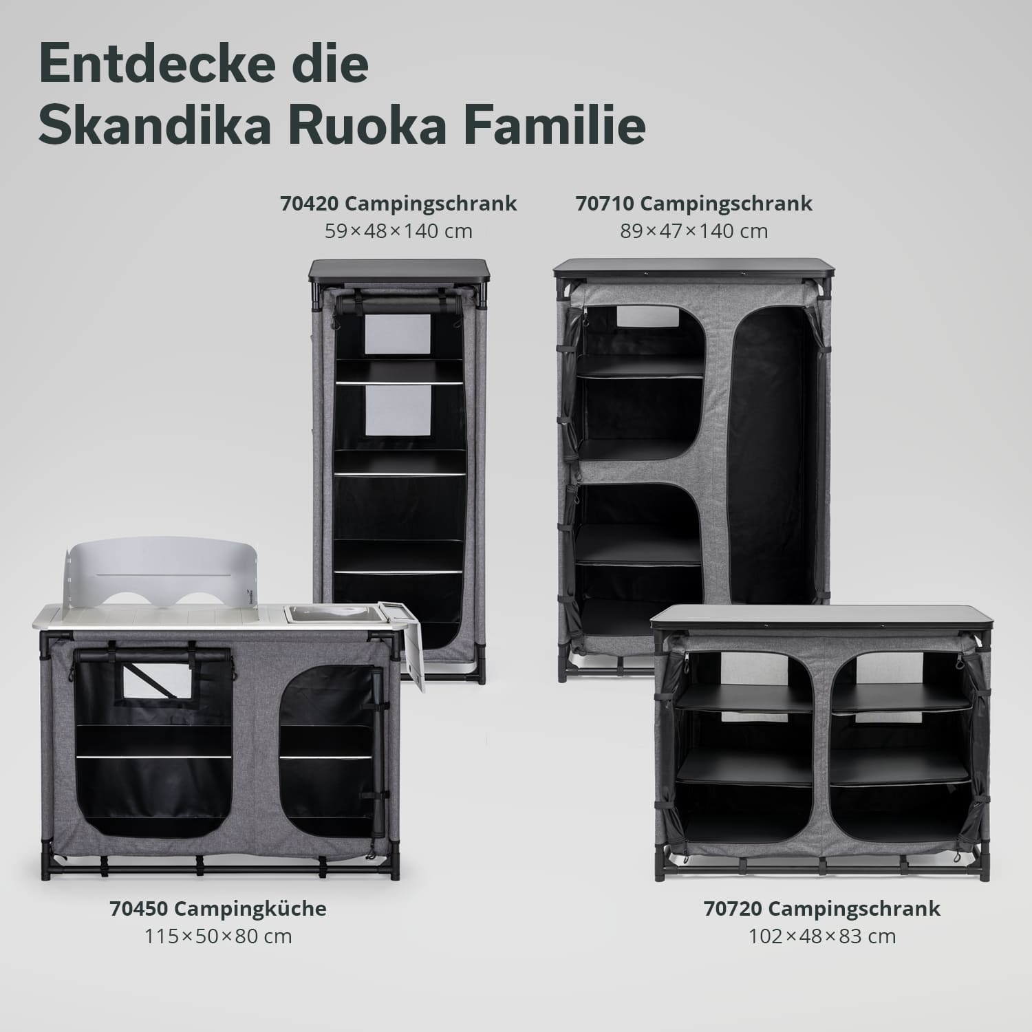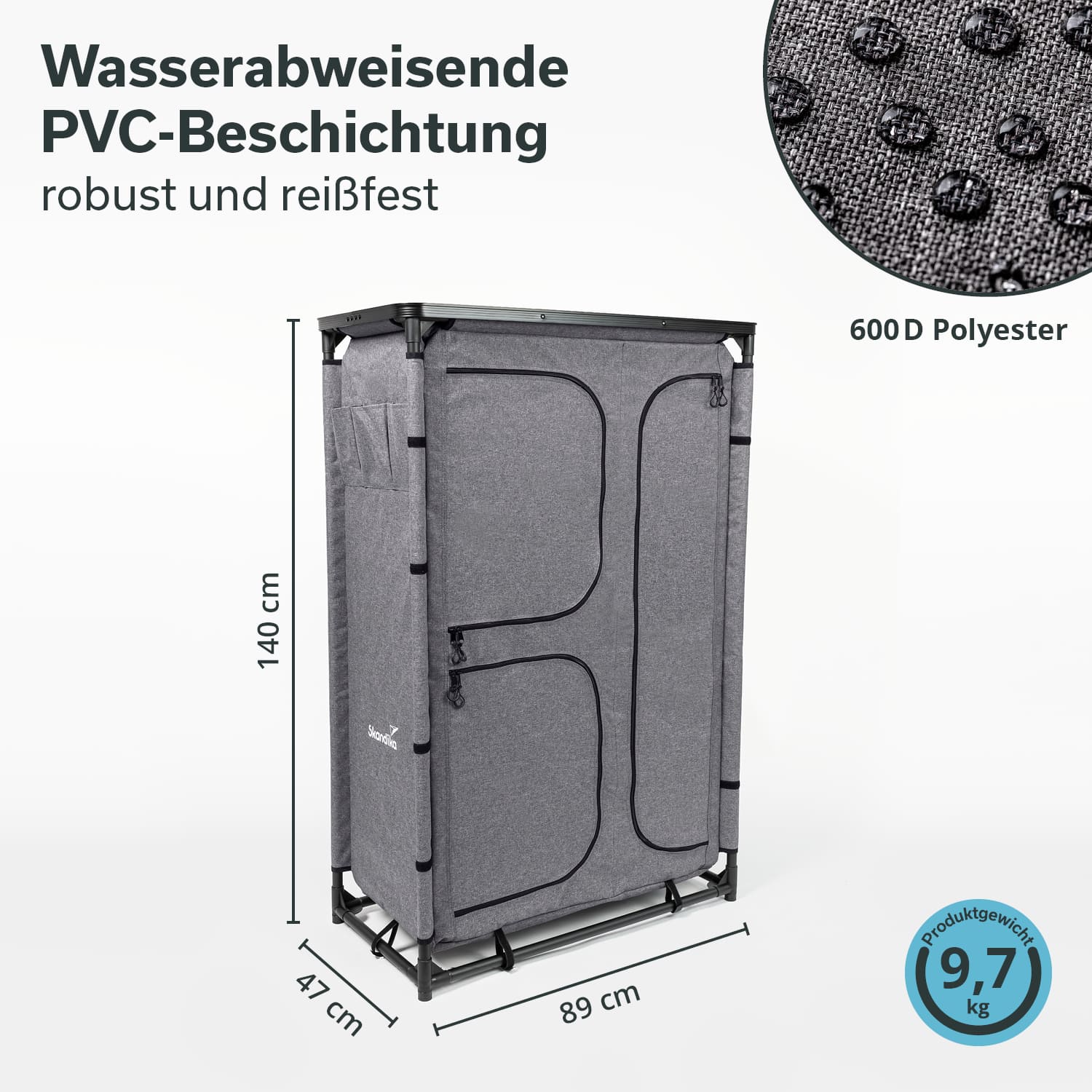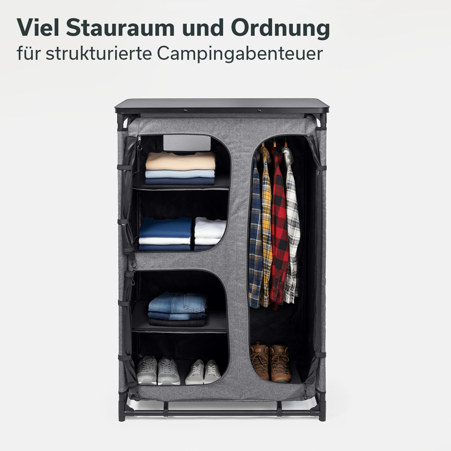 Nouvelle venue dans la gamme Skandika Ruoka, cette armoire de camping au design en forme de tour offre un espace de rangement particulièrement généreux tout en occupant un minimum d'espace au sol dans la tente. Elle constitue la solution idéale lorsque l'espace et la liberté de mouvement sont des priorités, mais que l'on souhaite tout de même garder ses affaires bien rangées. Avec son look chic, Ruoka fait même bonne figure à la maison en tant qu'armoire d'appoint dans la chambre d'amis ou comme penderie dans le couloir.