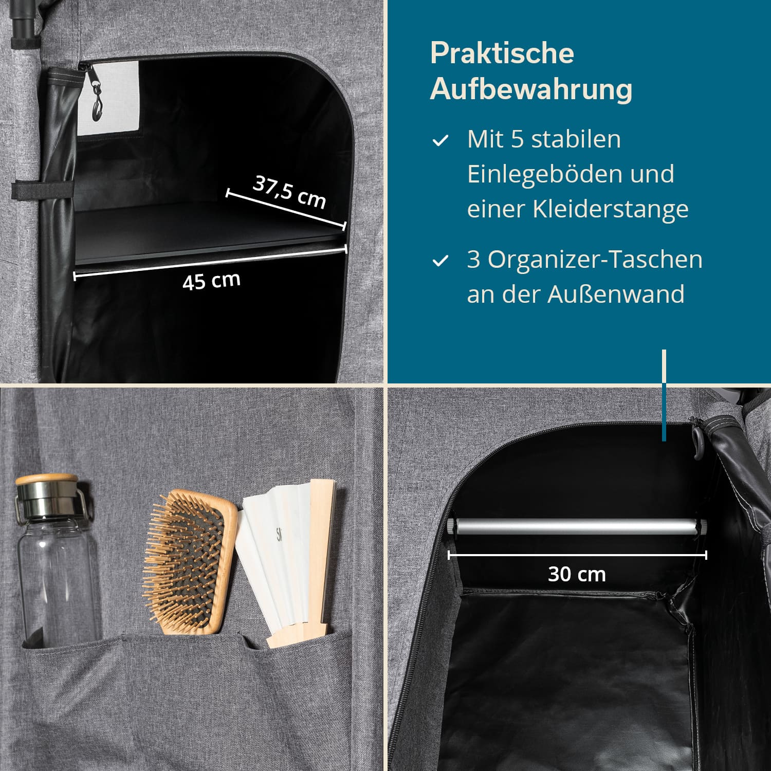 • À gauche, 4 grands compartiments de rangement ; à droite, une tringle de penderie pratique