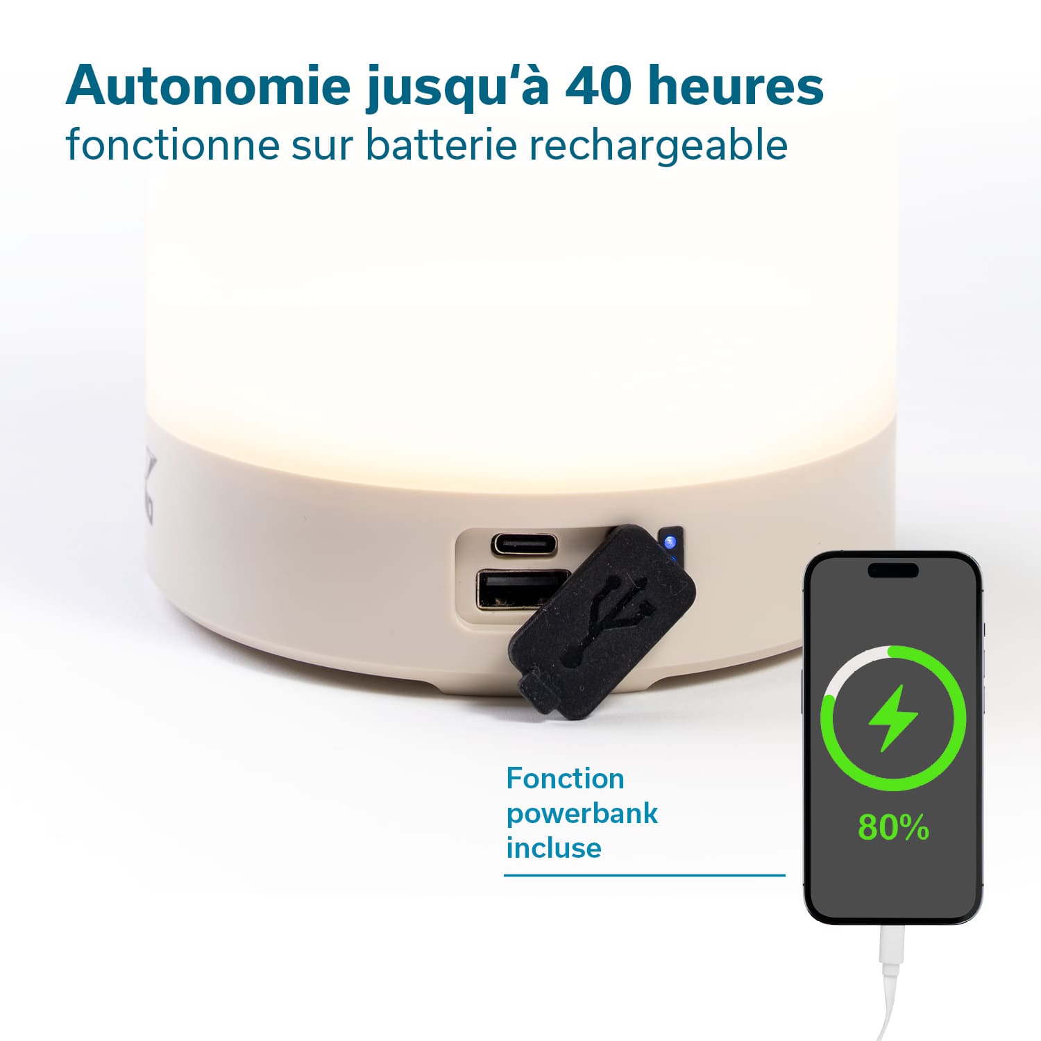 - Autonomie jusqu'à 8 heures / fonction powerbank / protégée contre les projections d'eau selon IPX4