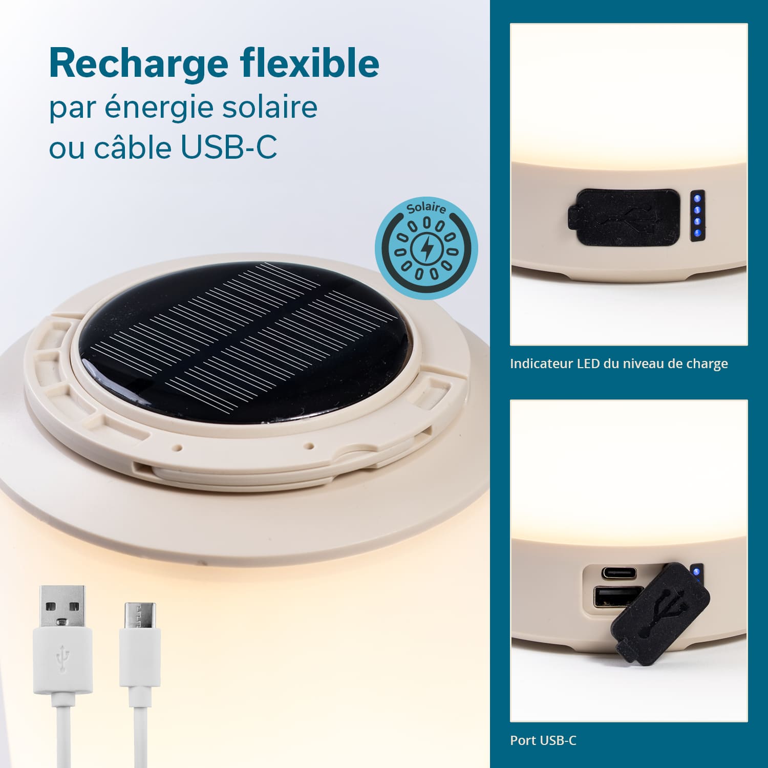 - Recharge via le câble USB-C fourni / le module solaire soutient le processus de charge