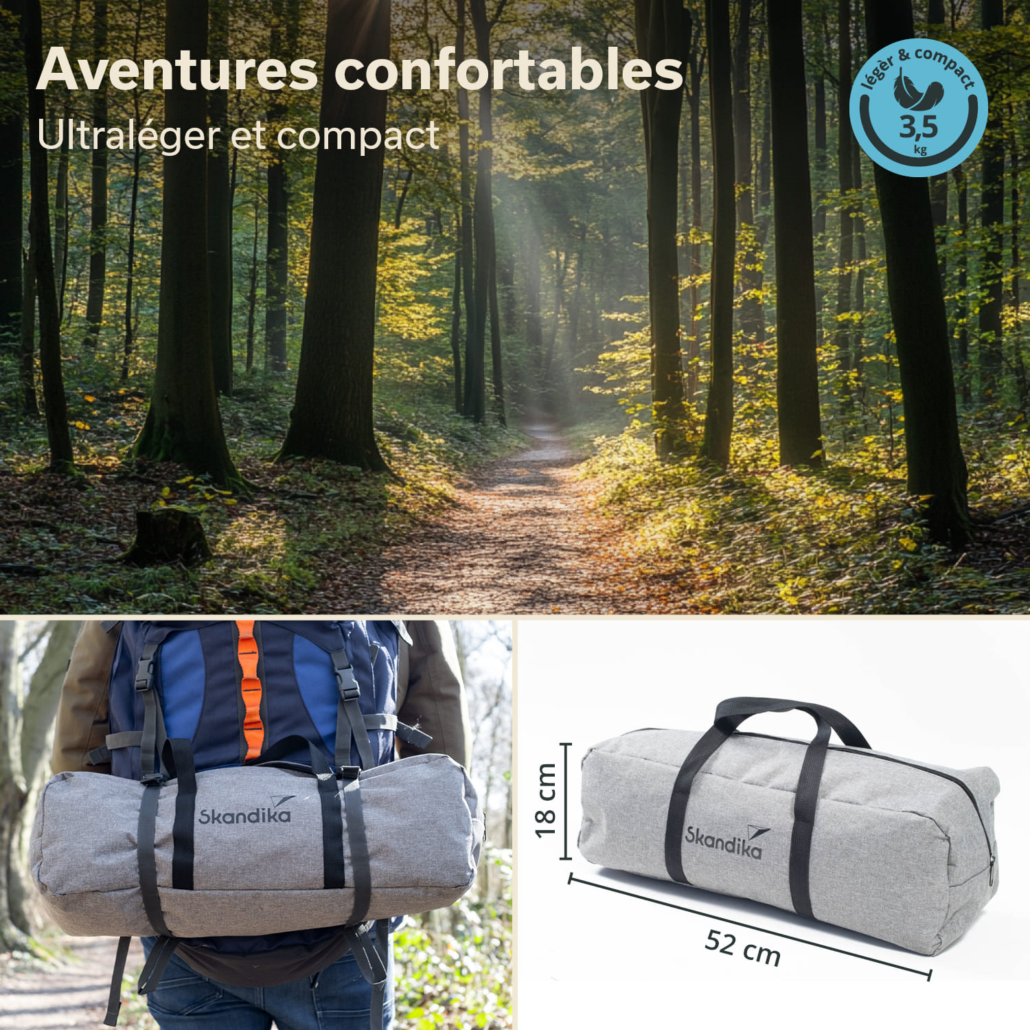 Un sac de transport pratique est fourni pour un rangement sûr et un transport facile. Ainsi, le lit de camp est toujours prêt pour une nouvelle aventure en camping !