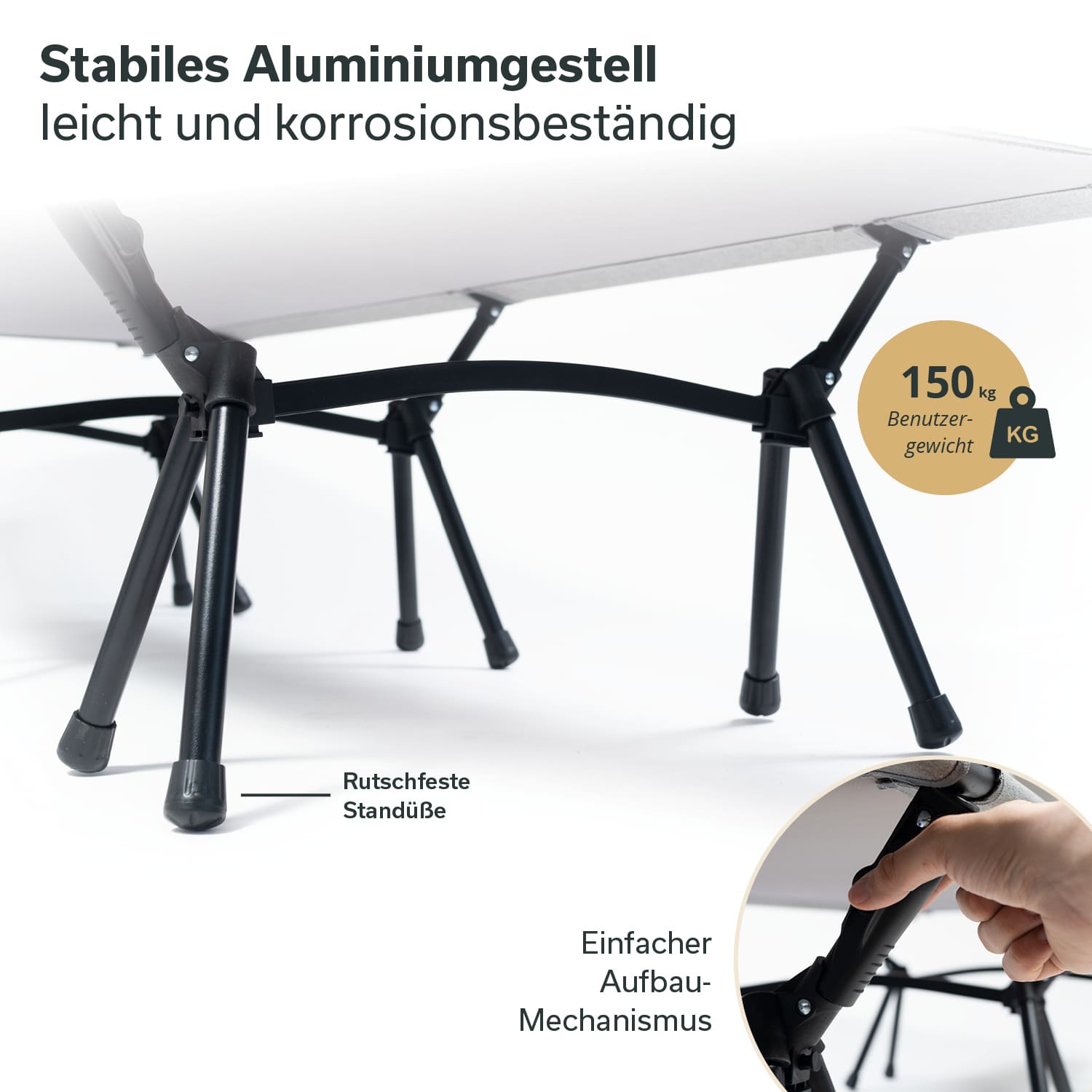 Le poids maximal de l'utilisateur est de 150 kg. Grâce à une construction intelligente, le cadre robuste en aluminium garantit dans tous les cas une bonne stabilité et un sommeil paisible.
