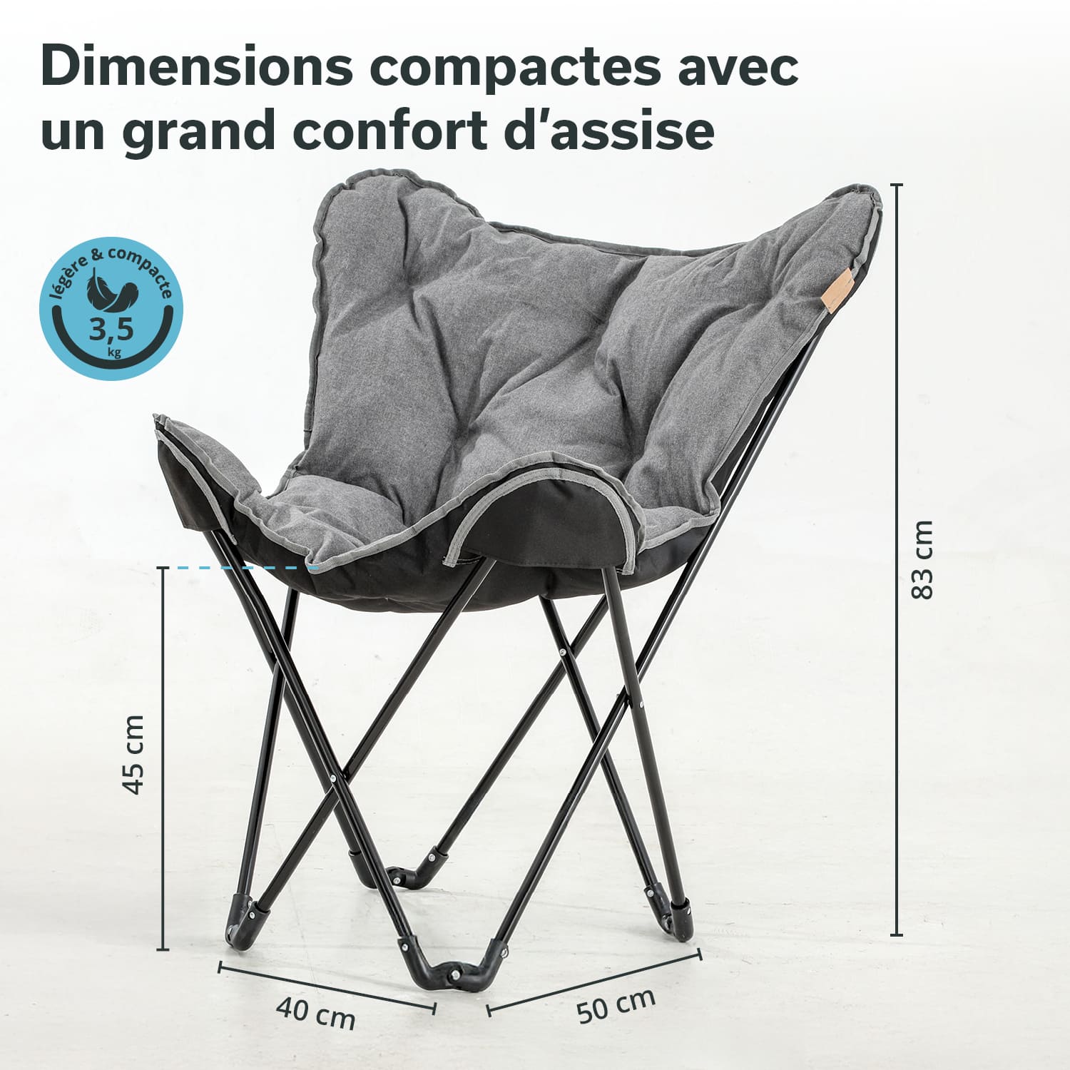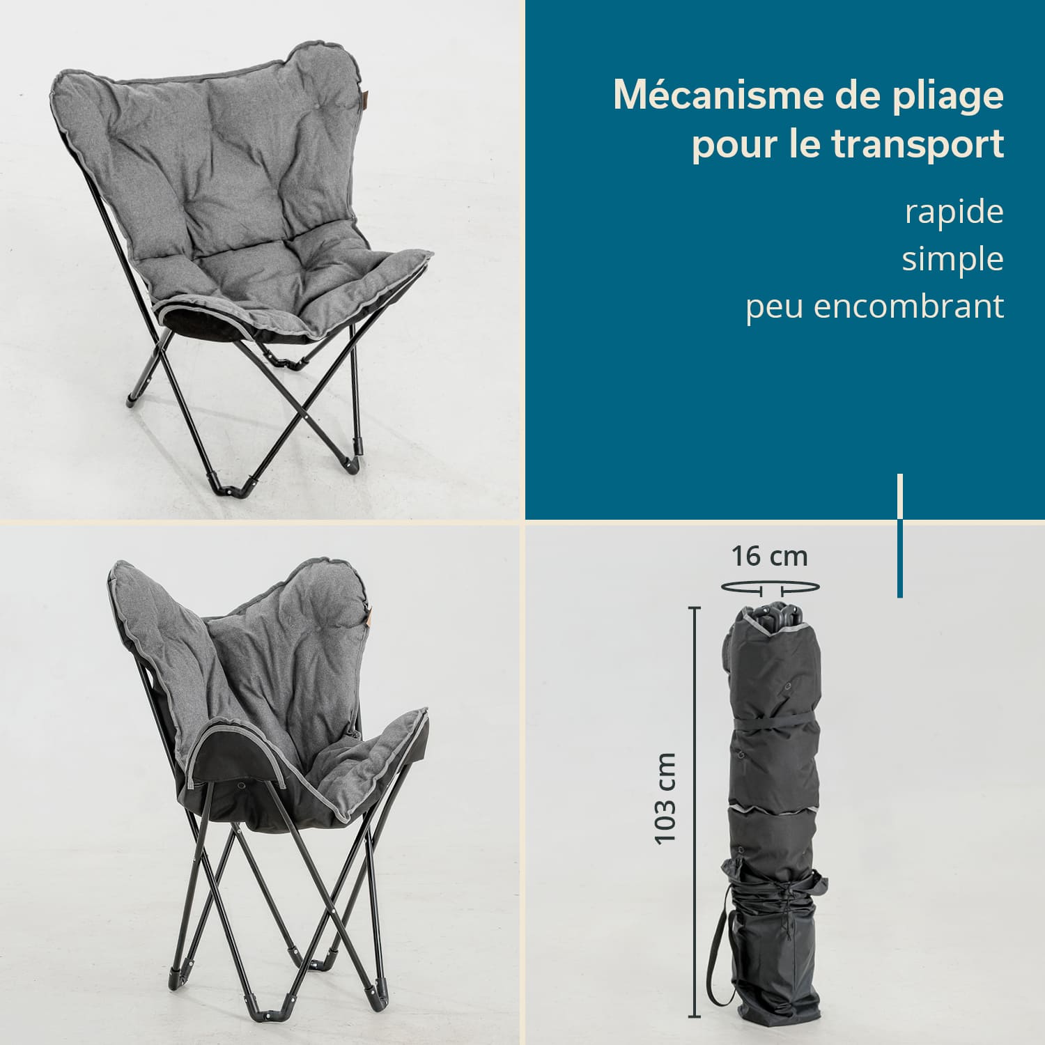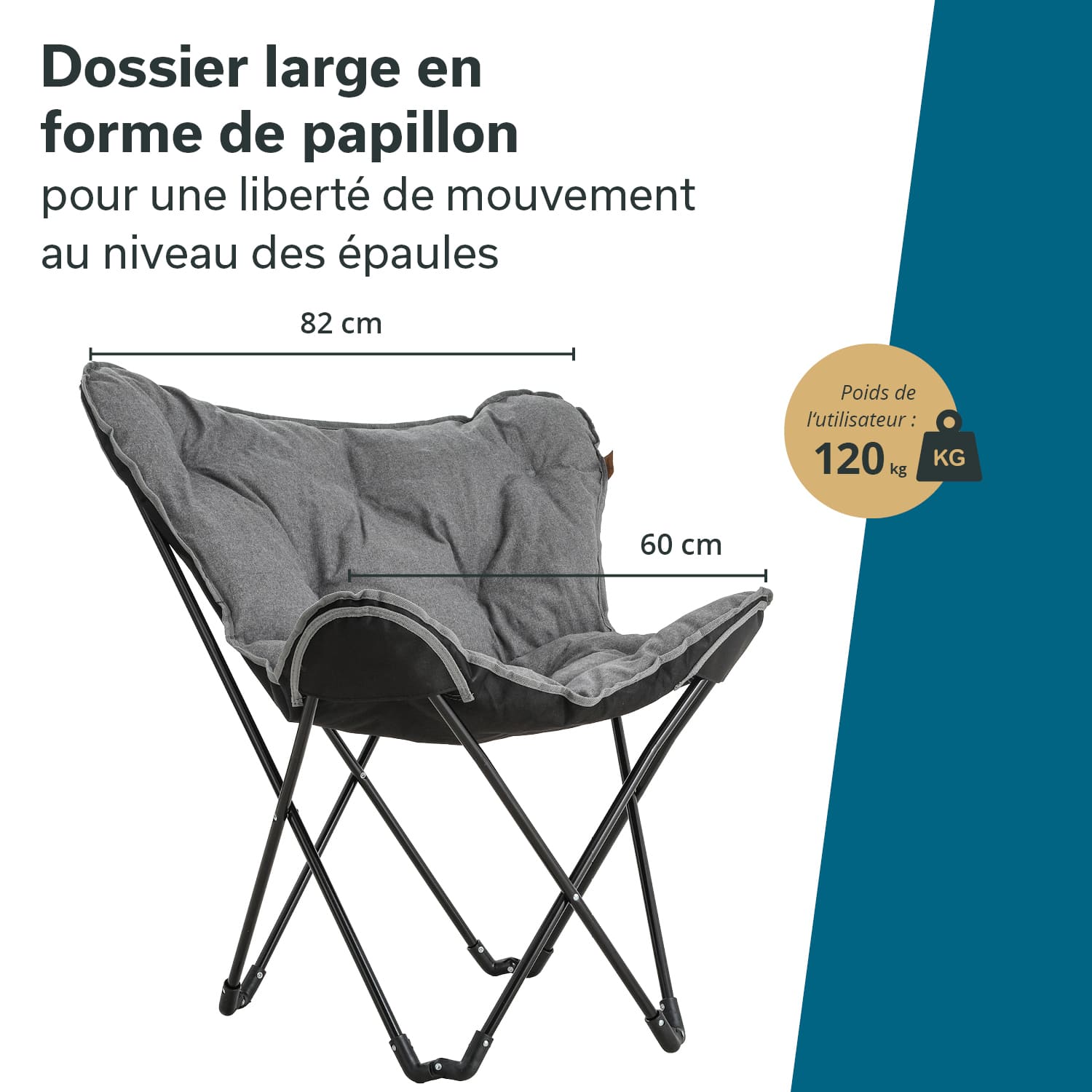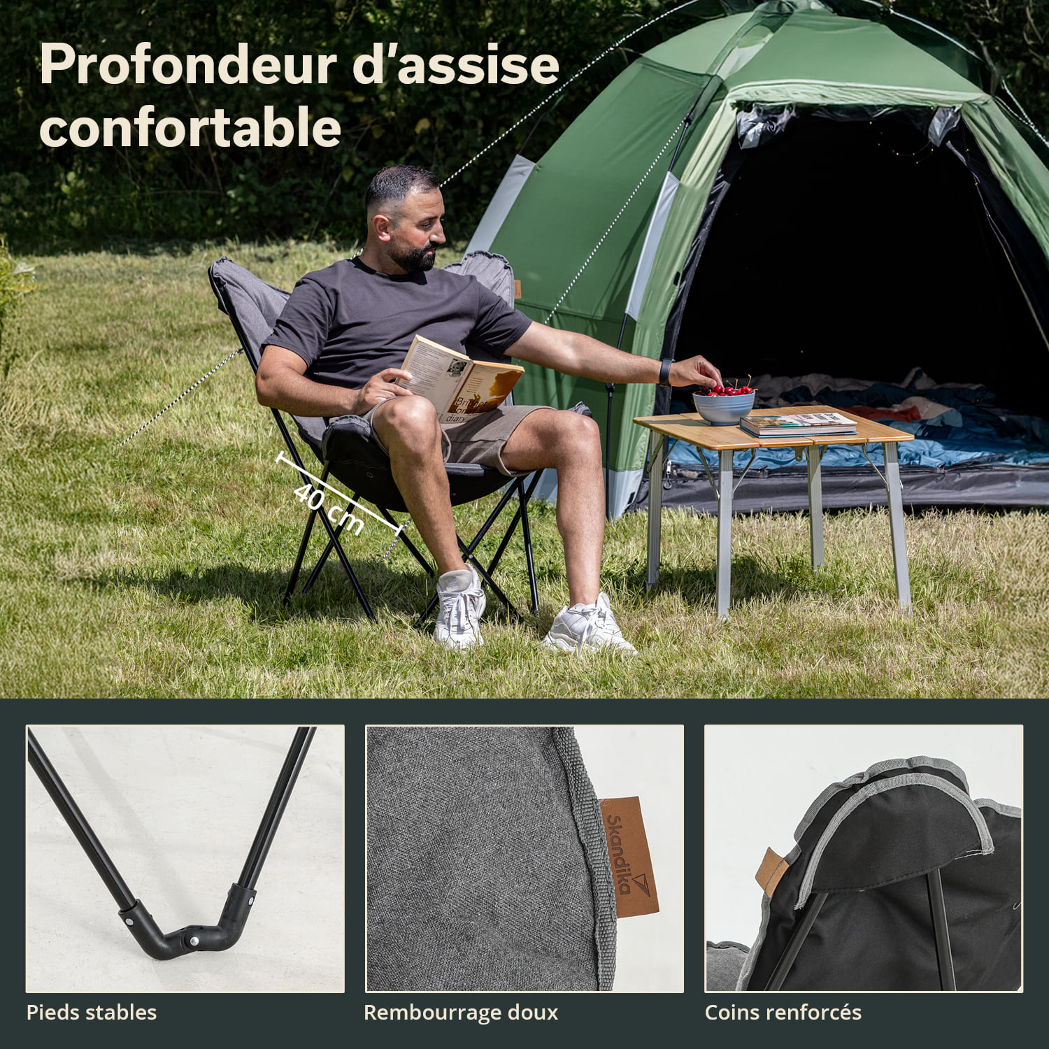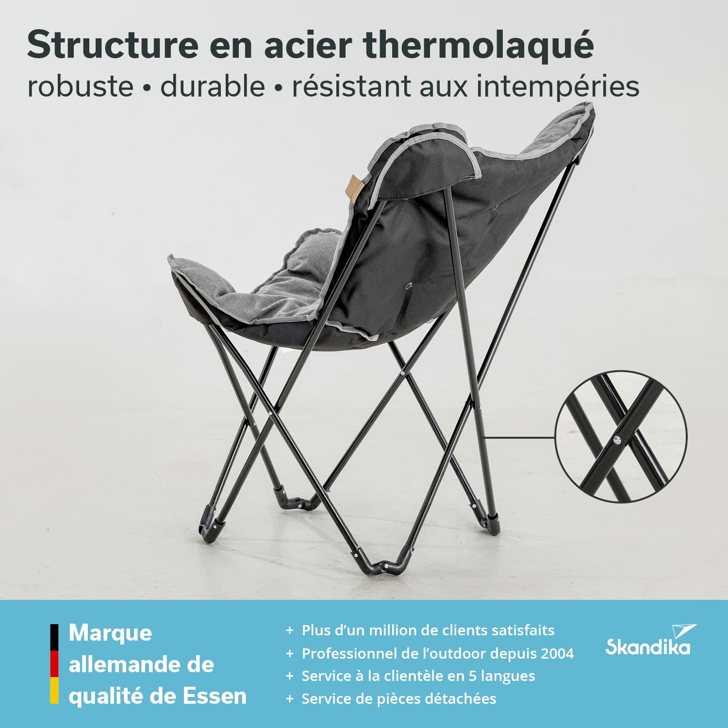 Notre fauteuil pliant Tolga de Skandika offre un haut niveau de confort et son design classique à boutons invite à se pencher en arrière et à s'installer confortablement. Il est pliable, portable et, grâce à son dossier rembourré en forme de papillon, il est idéal pour tous ceux qui attachent une grande importance au confort en camping.