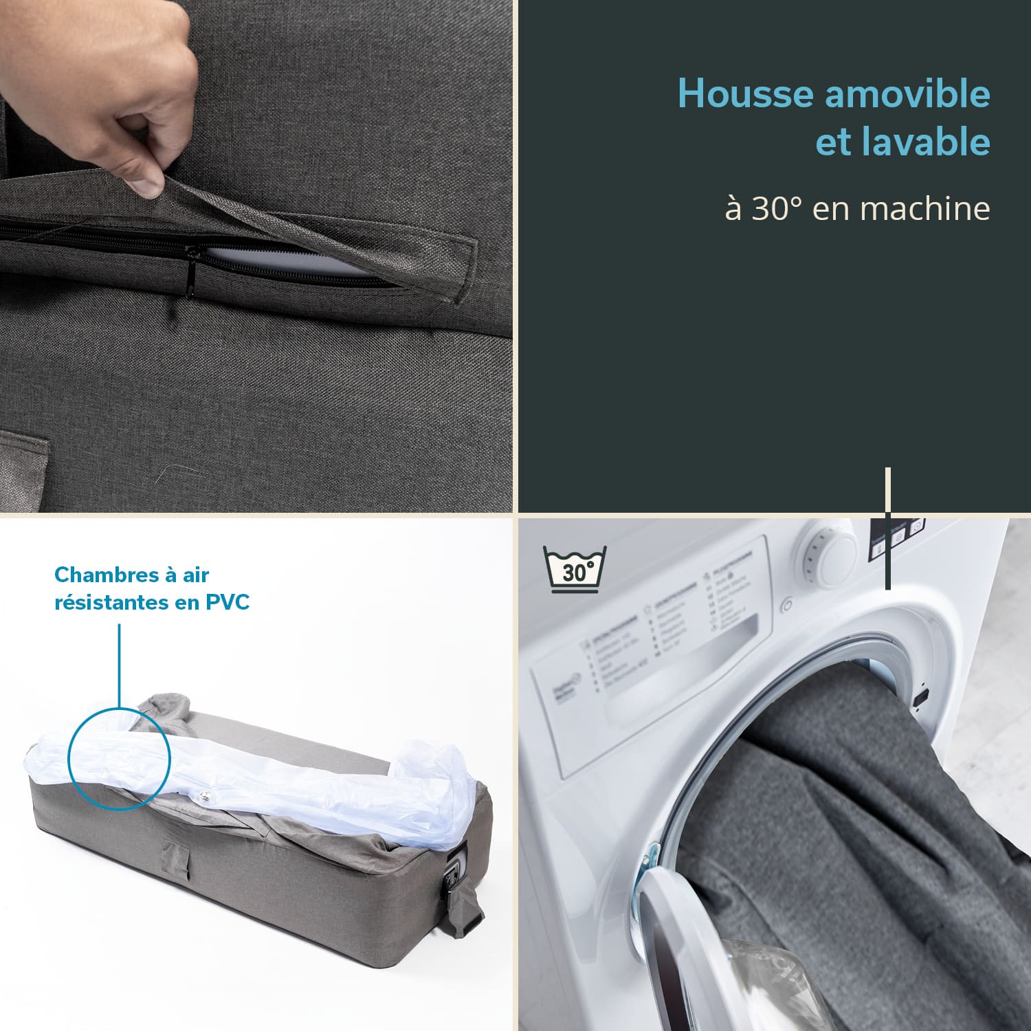 La pompe peut être retirée du canapé en cas de besoin et peut par ailleurs être utilisée pour d'autres produits gonflables grâce aux trois embouts de valve fournis.