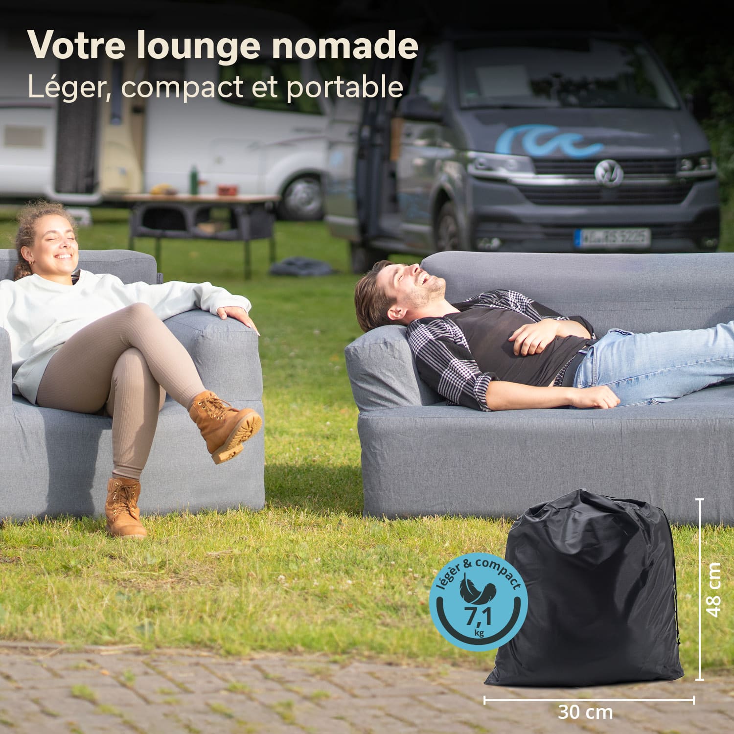 Le canapé stable peut supporter une charge de 200 kg et ne pèse que 7,1 kg. Une fois vide, il se range facilement dans le sac de transport fourni.