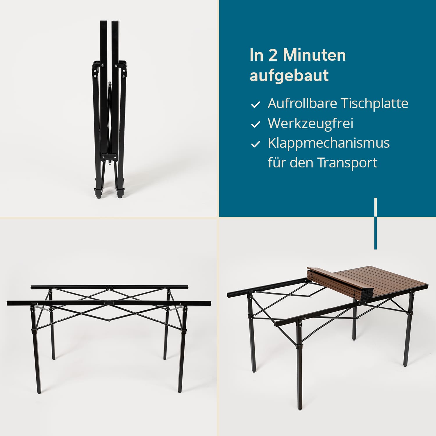 Le plateau en aluminium se déroule simplement, puis se pose sur la structure dépliée avant d'être fixée. Lorsqu'elle n'est pas utilisée, la table se replie en un clin d'œil pour atteindre un format compact et se range facilement.
