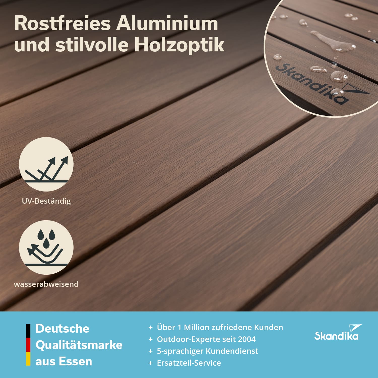 Le plateau en aluminium arbore un élégant aspect bois et est doté d'une surface antidérapante pratique, qui est également hydrofuge et se nettoie très aisément à l'aide d'un chiffon humide.