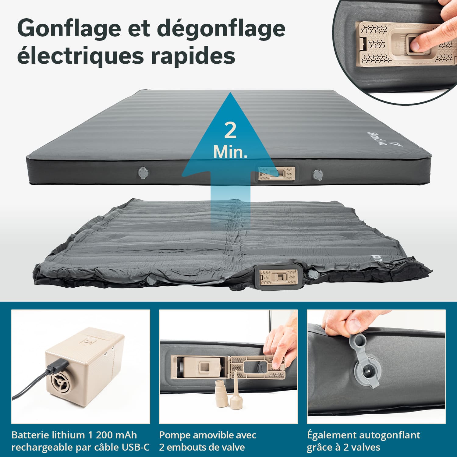 La pompe amovible rechargeable par USB-C gonfle rapidement le matelas sans avoir besoin d'une source d'alimentation, pour une utilisation sans stress.