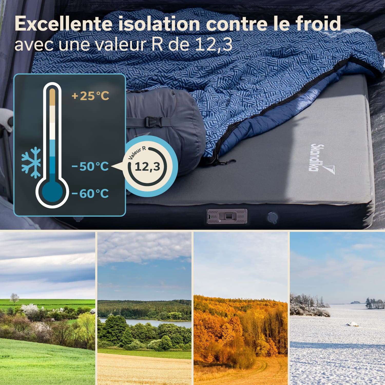 Avec une valeur R de 12,3, le matelas gonflable isole efficacement contre le froid du sol et garantit une température agréable même lorsque les températures extérieures sont basses.