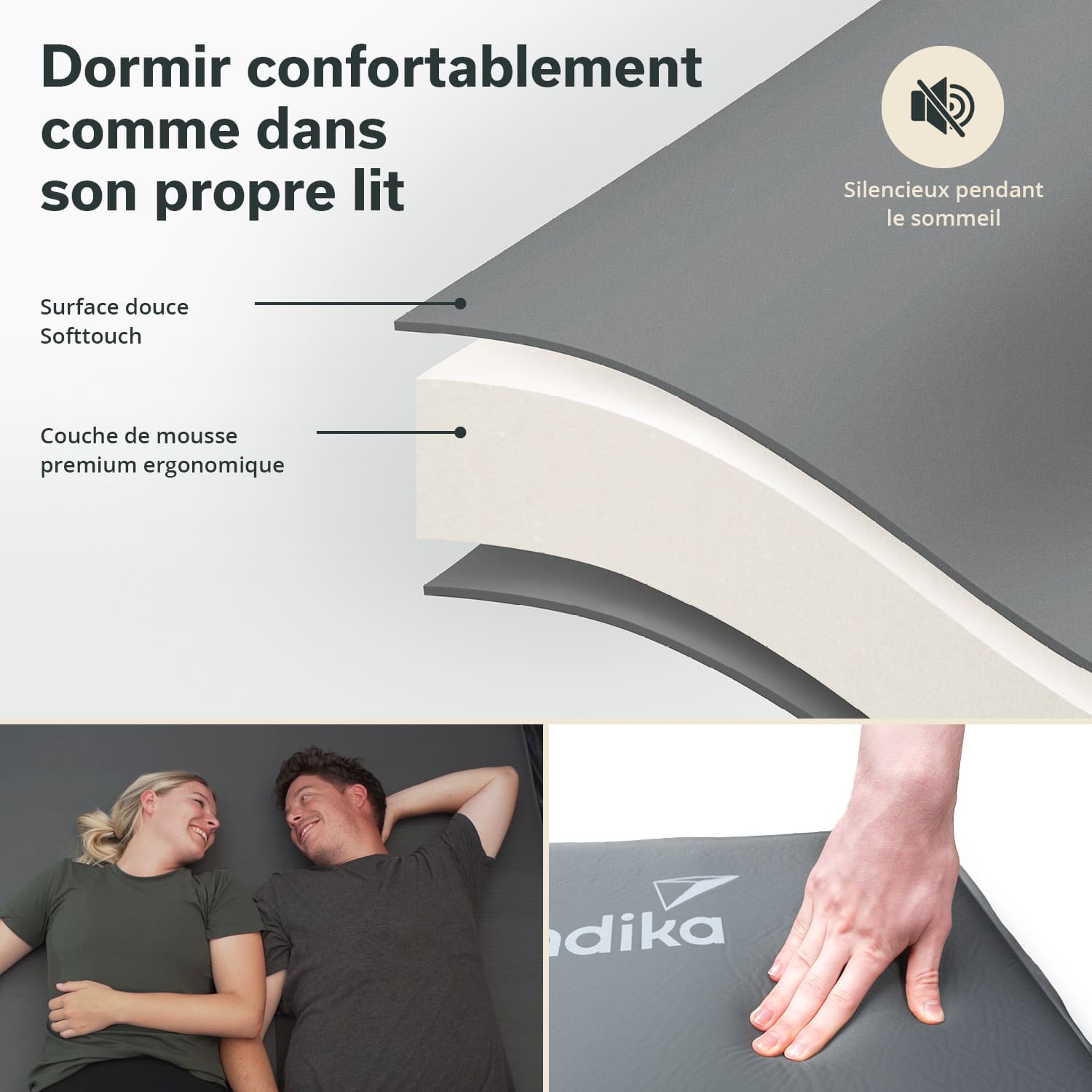 La couche de mousse haut de gamme avec surface Softtouch respirante garantit des nuits particulièrement reposantes, aussi bien à l'extérieur qu'à l'intérieur.