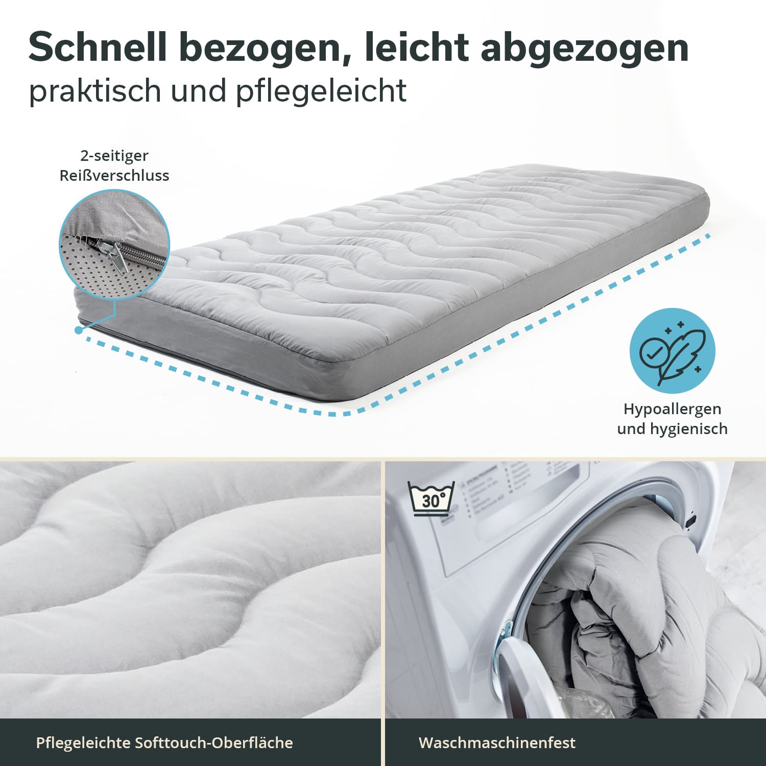 Idéale pour les dormeurs sensibles, la housse est hygiénique, douce pour la peau et exempte d'allergènes.