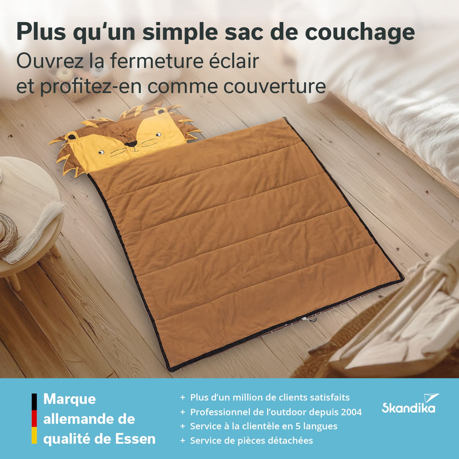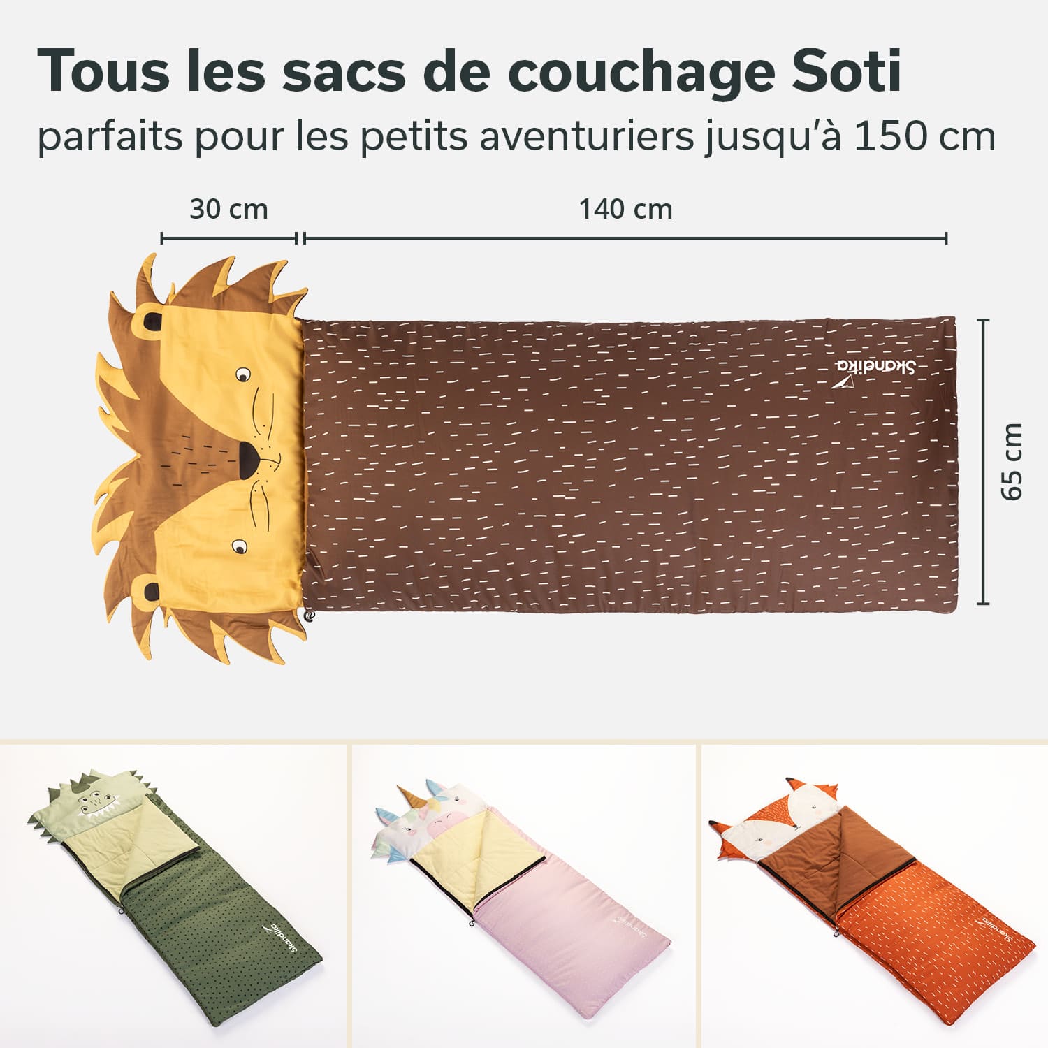 Dormir à l'extérieur, c'est amusant ! Que ce soit pendant les vacances chez papy et mamie, lors d'une soirée pyjama chez des amis de la maternelle ou en tant que professionnel de l'outdoor avec les parents au camping. Les sacs de couchage colorés attirent particulièrement l'attention avec leur grande tête à l'effigie d'un animal mignon. Finis les designs monochromes et ennuyeux. Avec les Sotis de Skandika, le lion, le dinosaure, la licorne et le renard aident à chasser la peur du noir et procurent beaucoup de plaisir. Soti - le compagnon animalier des petits aventuriers !