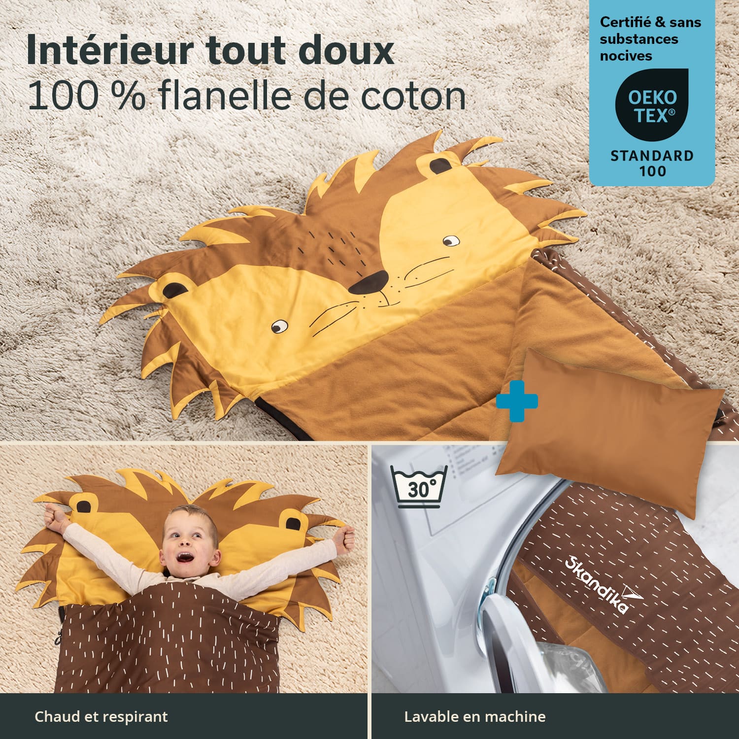 La certification OEKO-TEX® 100 des matériaux assure la haute qualité des sacs de couchage. Au cas où ces compagnons animaux se saliraient, ils peuvent être lavés à 30 °C sur un cycle délicat.