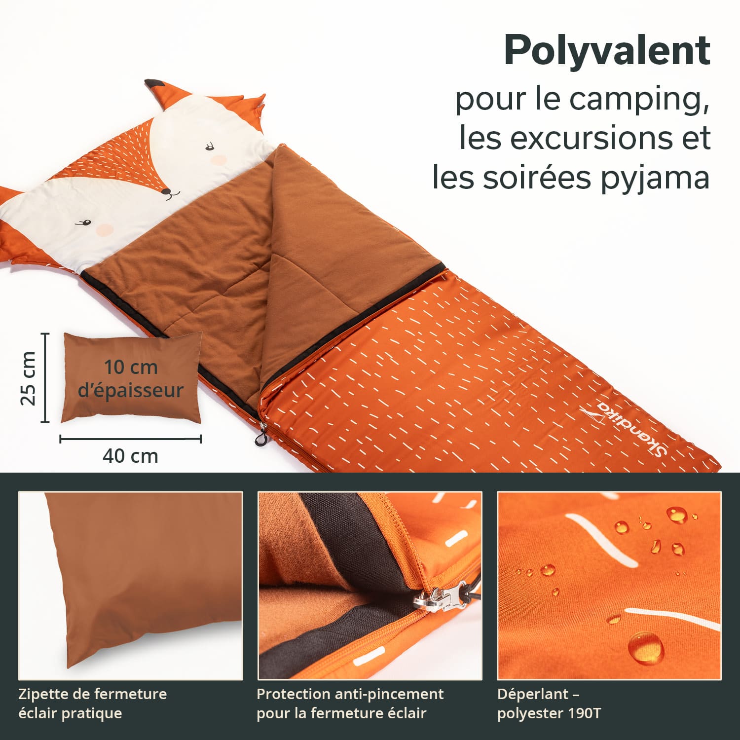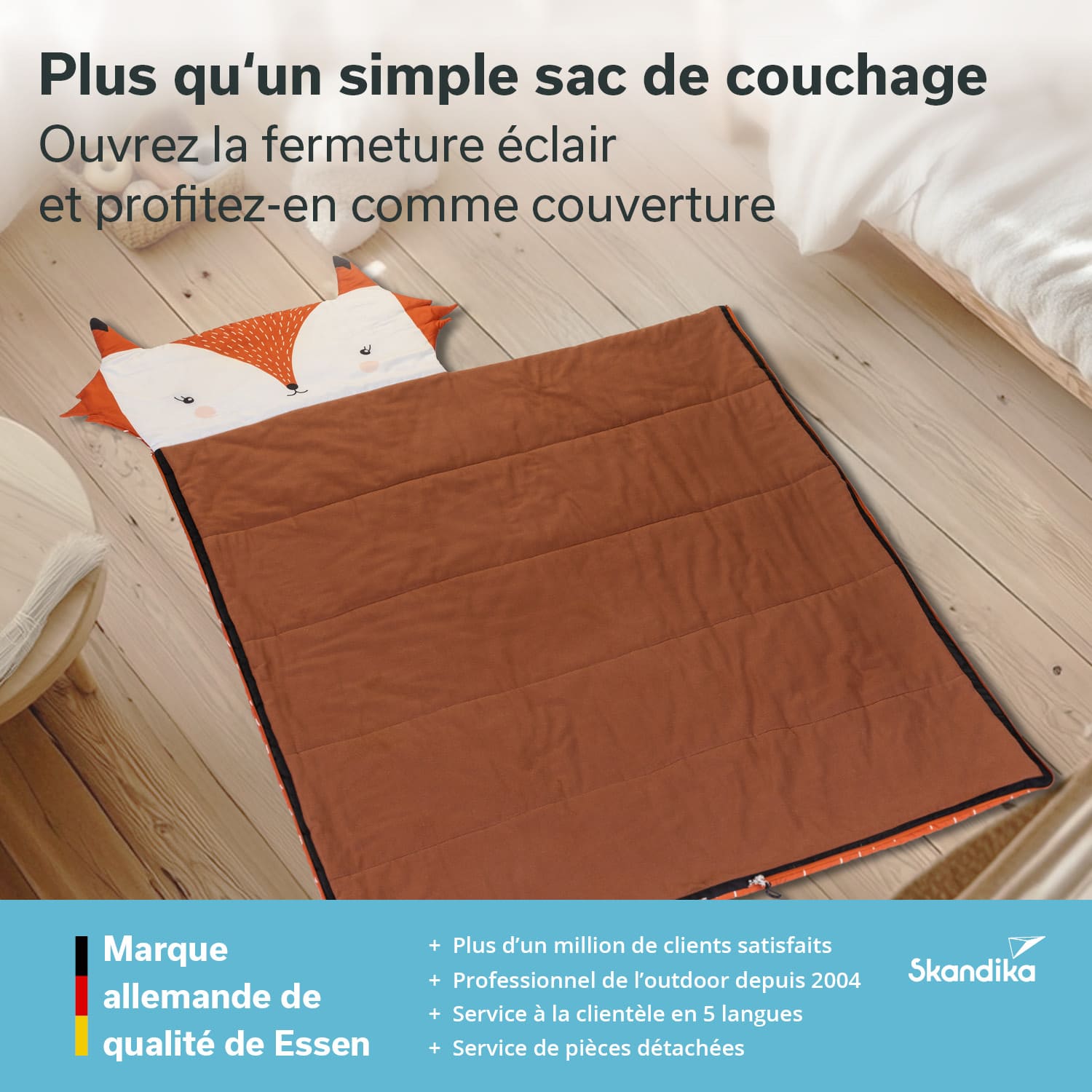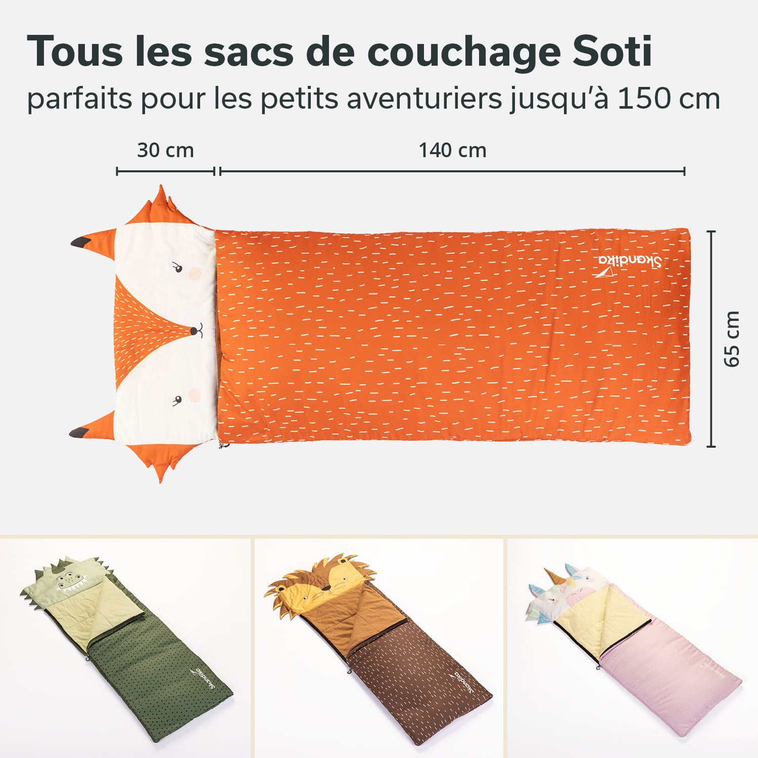 Dormir à l'extérieur, c'est amusant ! Que ce soit pendant les vacances chez papy et mamie, lors d'une soirée pyjama chez des amis de la maternelle ou en tant que professionnel de l'outdoor avec les parents au camping. Les sacs de couchage colorés attirent particulièrement l'attention avec leur grande tête à l'effigie d'un animal mignon. Finis les designs monochromes et ennuyeux. Avec les Sotis de Skandika, le lion, le dinosaure, la licorne et le renard aident à chasser la peur du noir et procurent beaucoup de plaisir. Soti - le compagnon animalier des petits aventuriers !