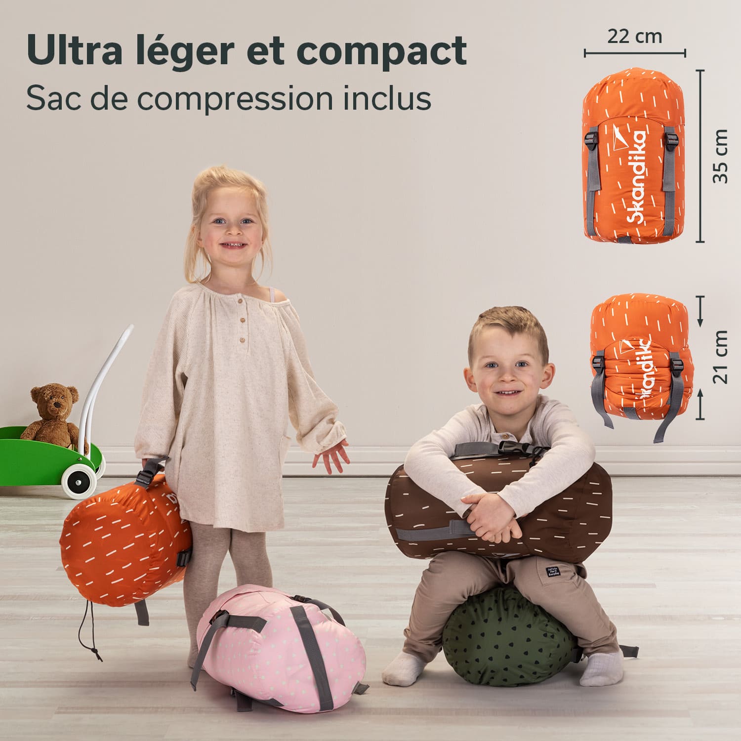 • Le sac de compression de couleur assortie au sac de couchage réduit la taille du paquet