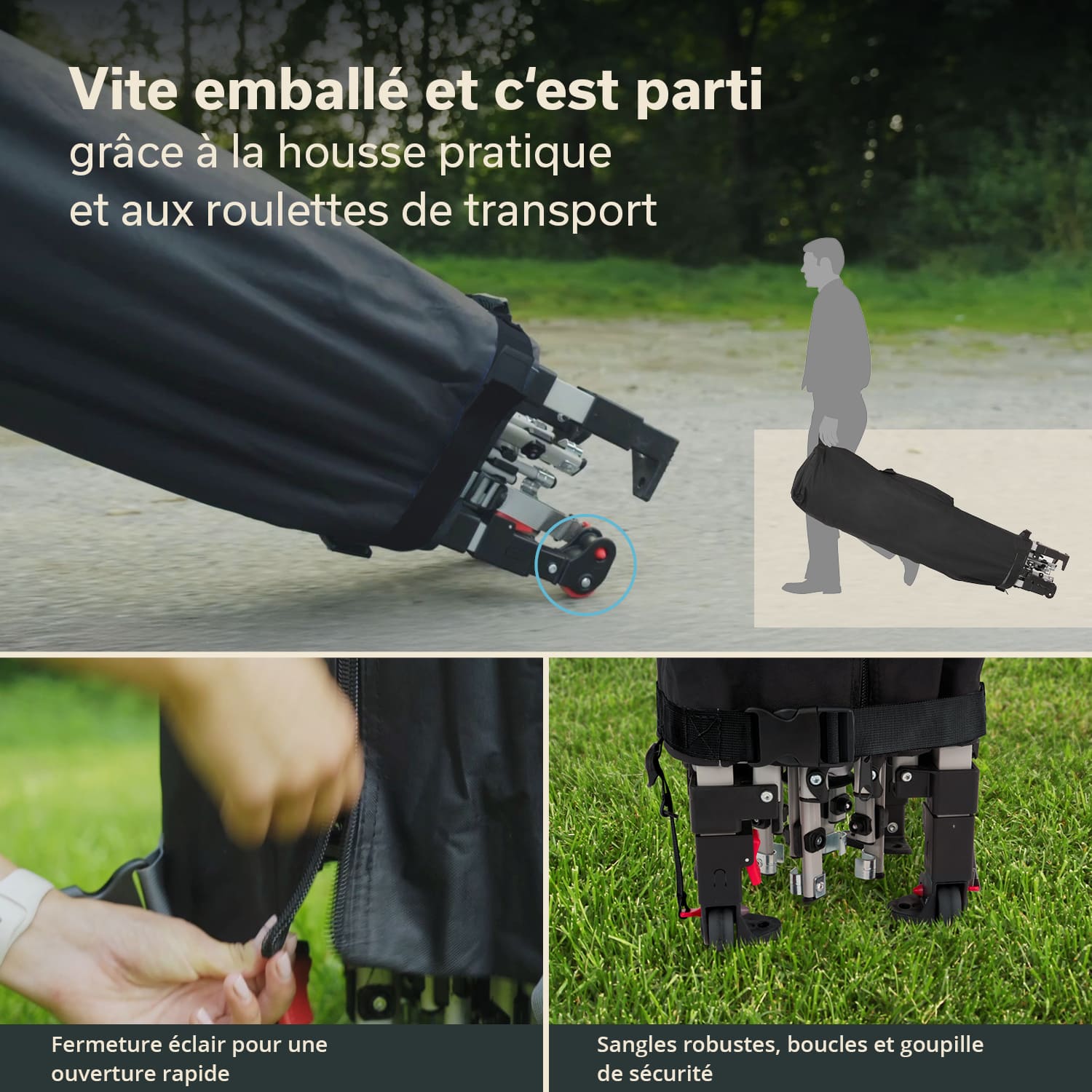 Une fois plié et rangé dans son sac Stop “n” Go, le pavillon peut être transporté très facilement grâce à deux roulettes intégrées dans les pieds. La pochette de rangement cousue supplémentaire permet de ranger les accessoires tels que les cordes de haubanage, les sardines et les sacs de lestage