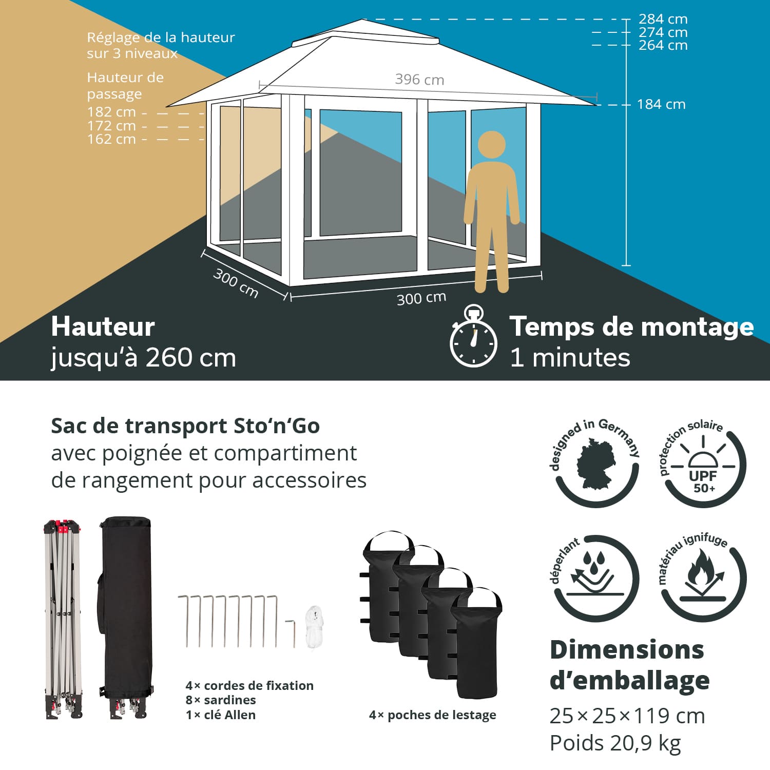 - Surface intérieure : 300 × 300 cm / Surface protégée : 396 × 396 cm / Hauteur totale : 284 / 274 / 264 cm
