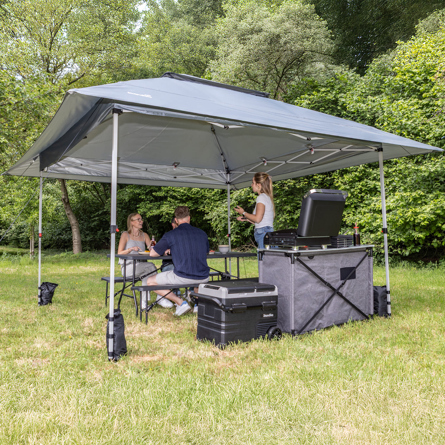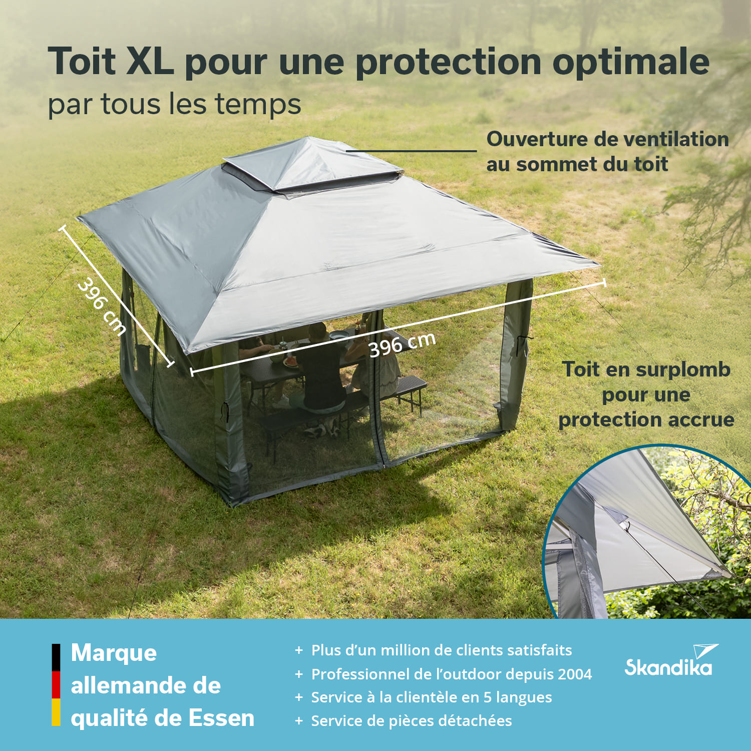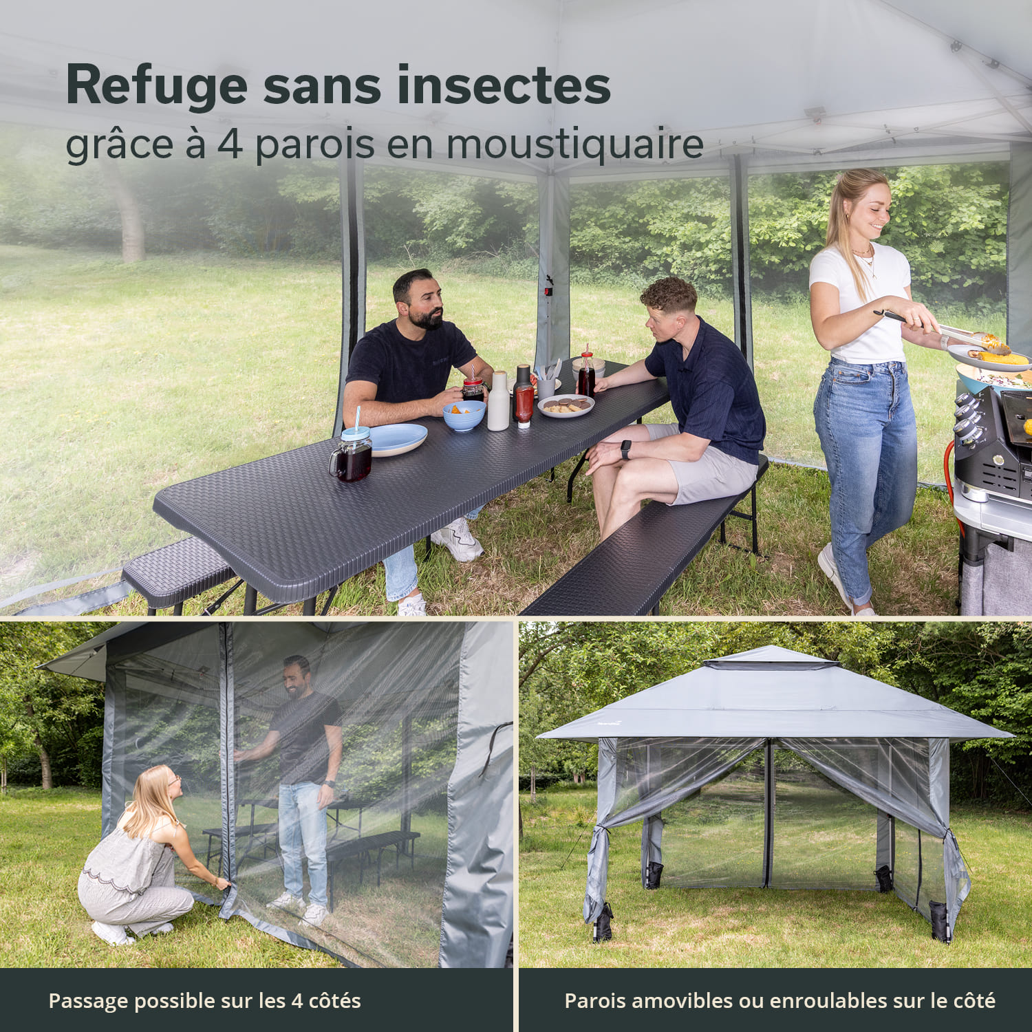 Le pavillon pliant Solvorn de Skandika, avec son mécanisme breveté à une main pour un montage en un temps record et avec une hauteur intérieure aérée bien supérieure à la moyenne, est le choix parfait pour toutes les situations où il faut un coin d'ombre ou un peu de protection contre la pluie. Ce modèle Plus offre en outre une protection particulière, y compris contre les insectes gênants, grâce au toit qui dépasse et aux parois amovibles en filet.