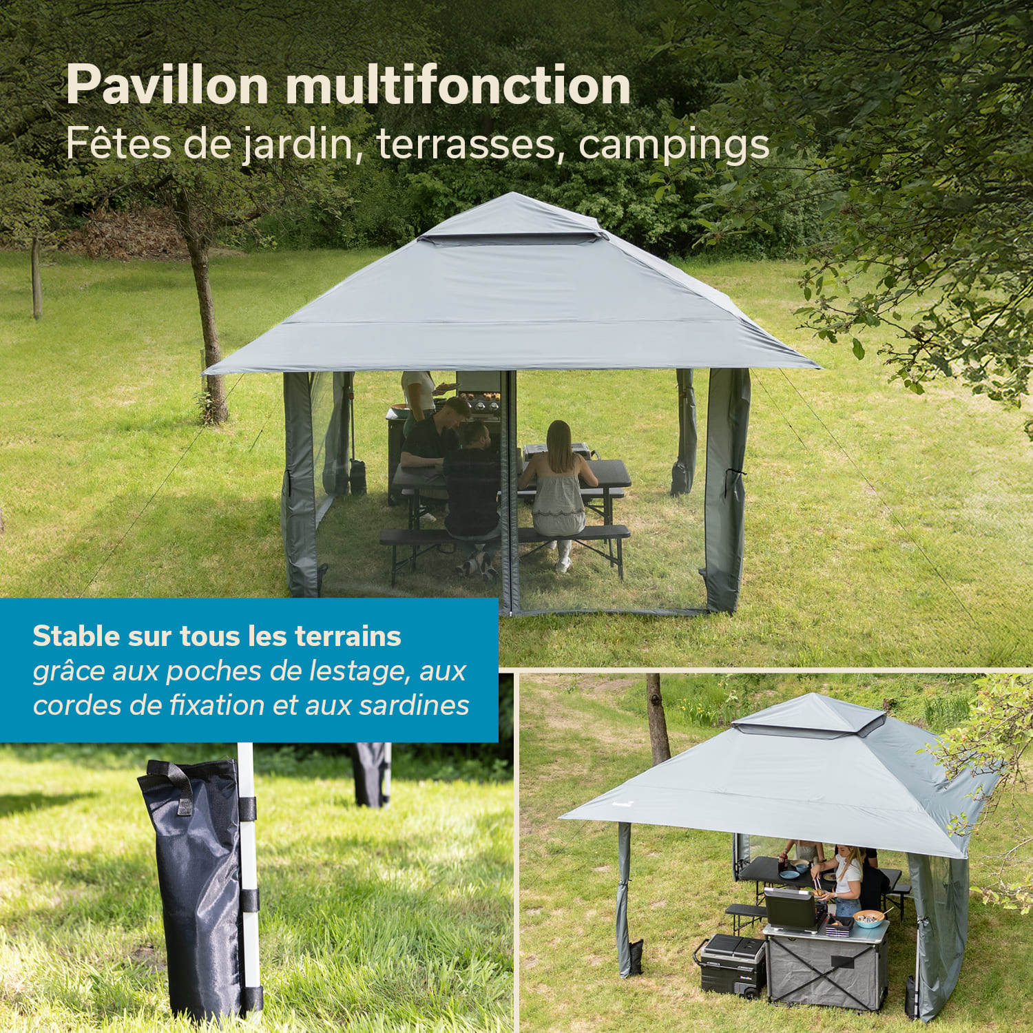 Les cordes de haubanage et les sardines fournis ainsi que les quatre sacs de lestage, qui peuvent être fixés au besoin par velcro en bas des pieds une fois remplis, assurent une bonne stabilité supplémentaire en cas de vent léger. Le pavillon n'est pas adapté à une utilisation dans des conditions météorologiques extrêmes.