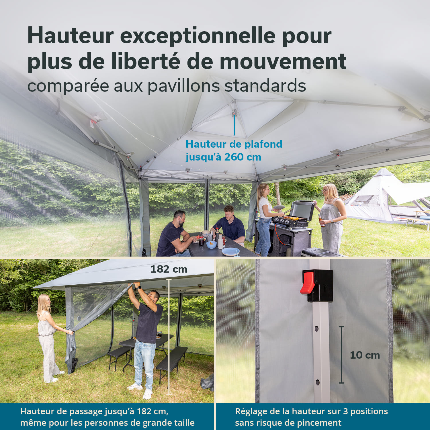La hauteur du pavillon est réglable et verrouillable sur trois niveaux à l'aide de leviers de sécurité qui empêchent de se coincer les doigts. Même pour les personnes de grande taille, le passage sous les côtés est agréablement haut. L'avancée de toit de ce modèle apporte le petit plus en matière d'ombre et de protection contre la pluie et augmente la surface protégée à un total de 396 × 396 cm.