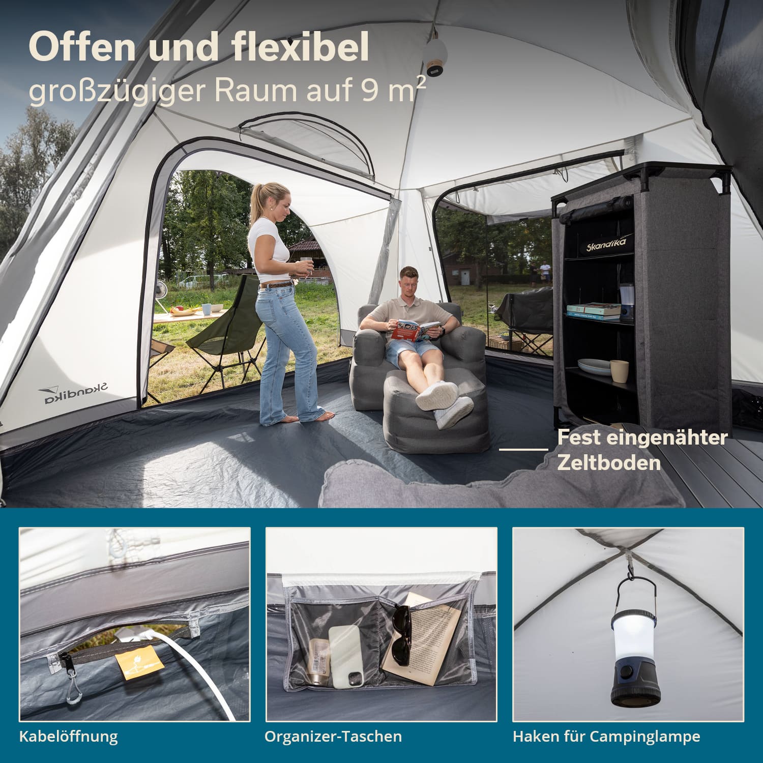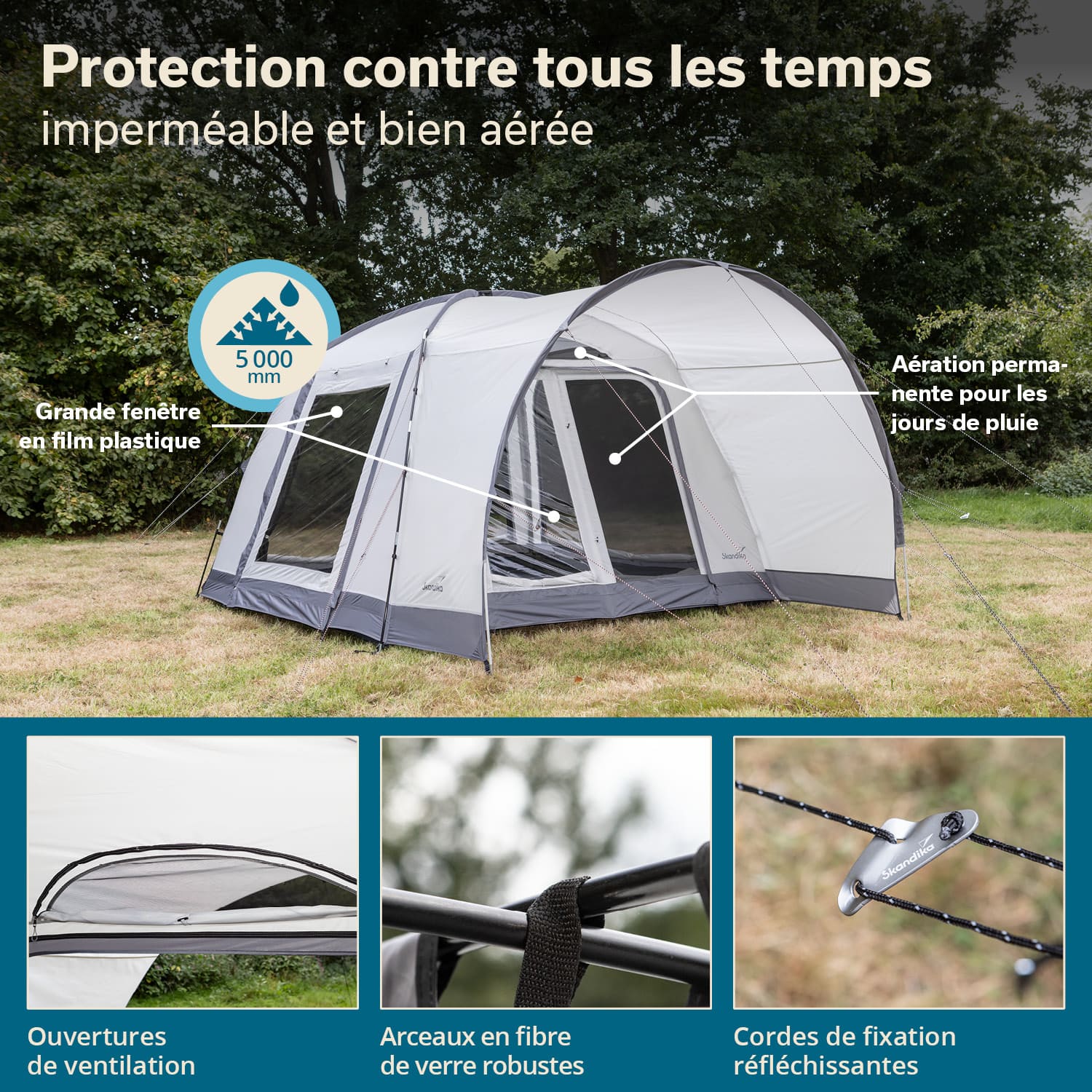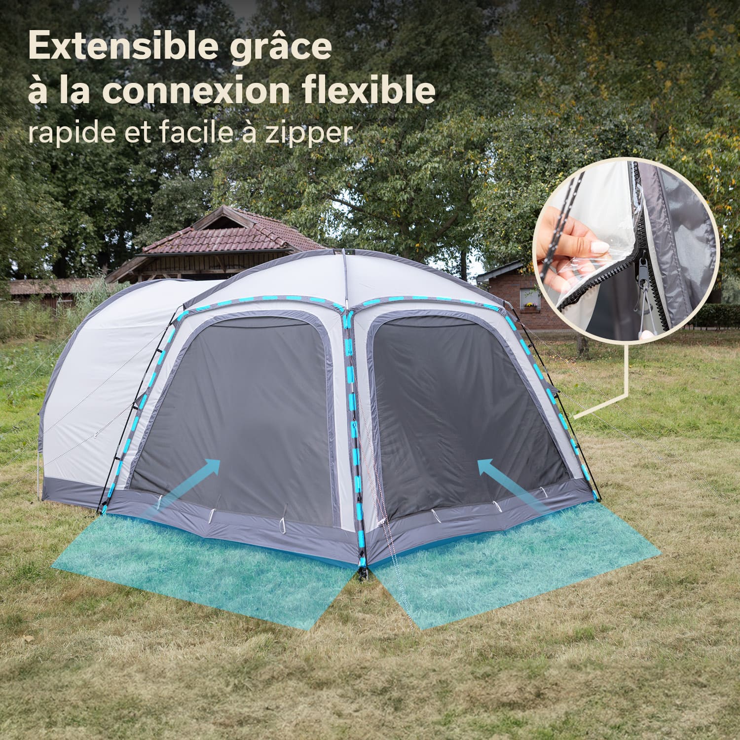 Des extras pratiques tels qu'un crochet pour suspendre une lampe de camping, des poches de rangement, un passage protégé pour les câbles et des cordes réfléchissantes offrent un confort et une sécurité supplémentaires au quotidien en camping.