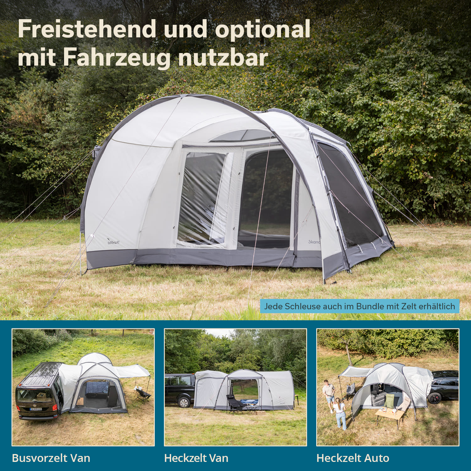 La Pitea 4 Flex Protect autonome est au cœur d'un système modulaire bien pensé et peut être adapté individuellement à différents types de véhicules et situations de camping grâce à des modules de sas disponibles séparément.
