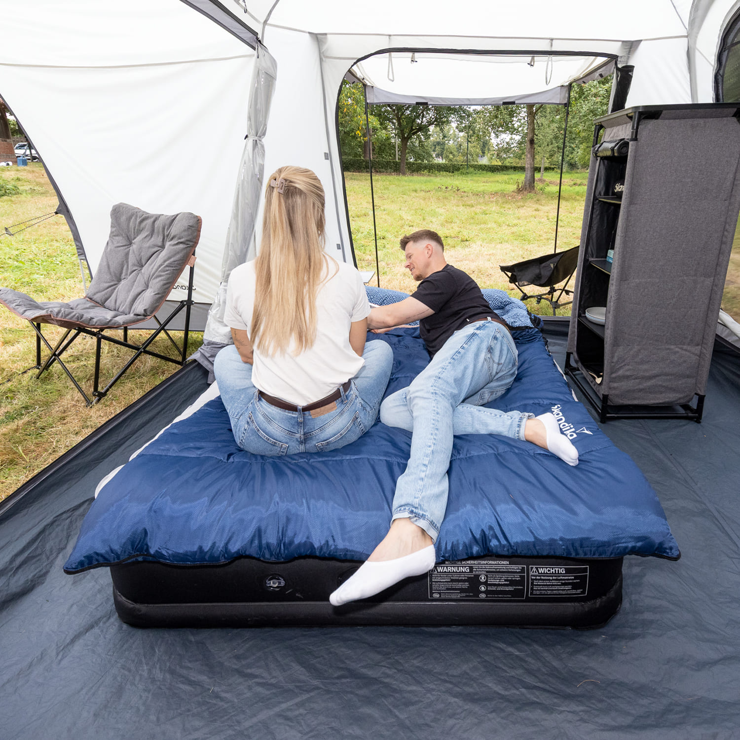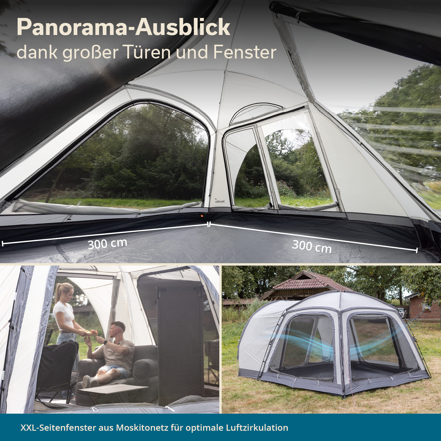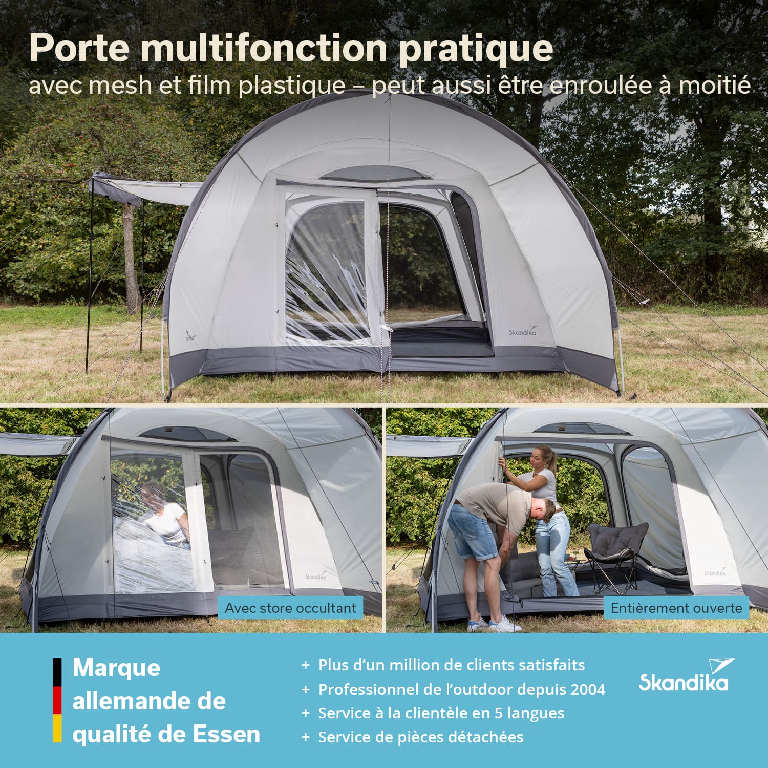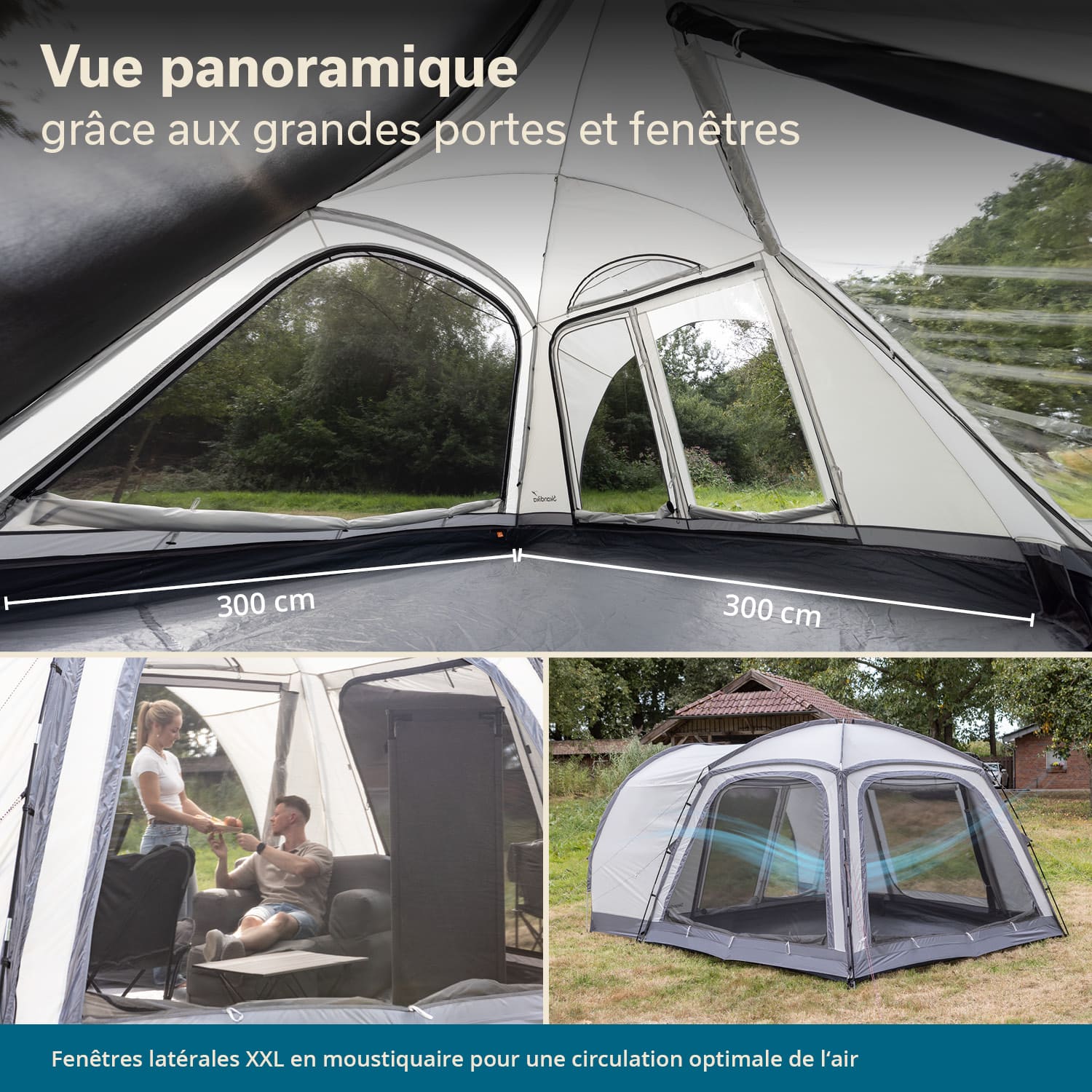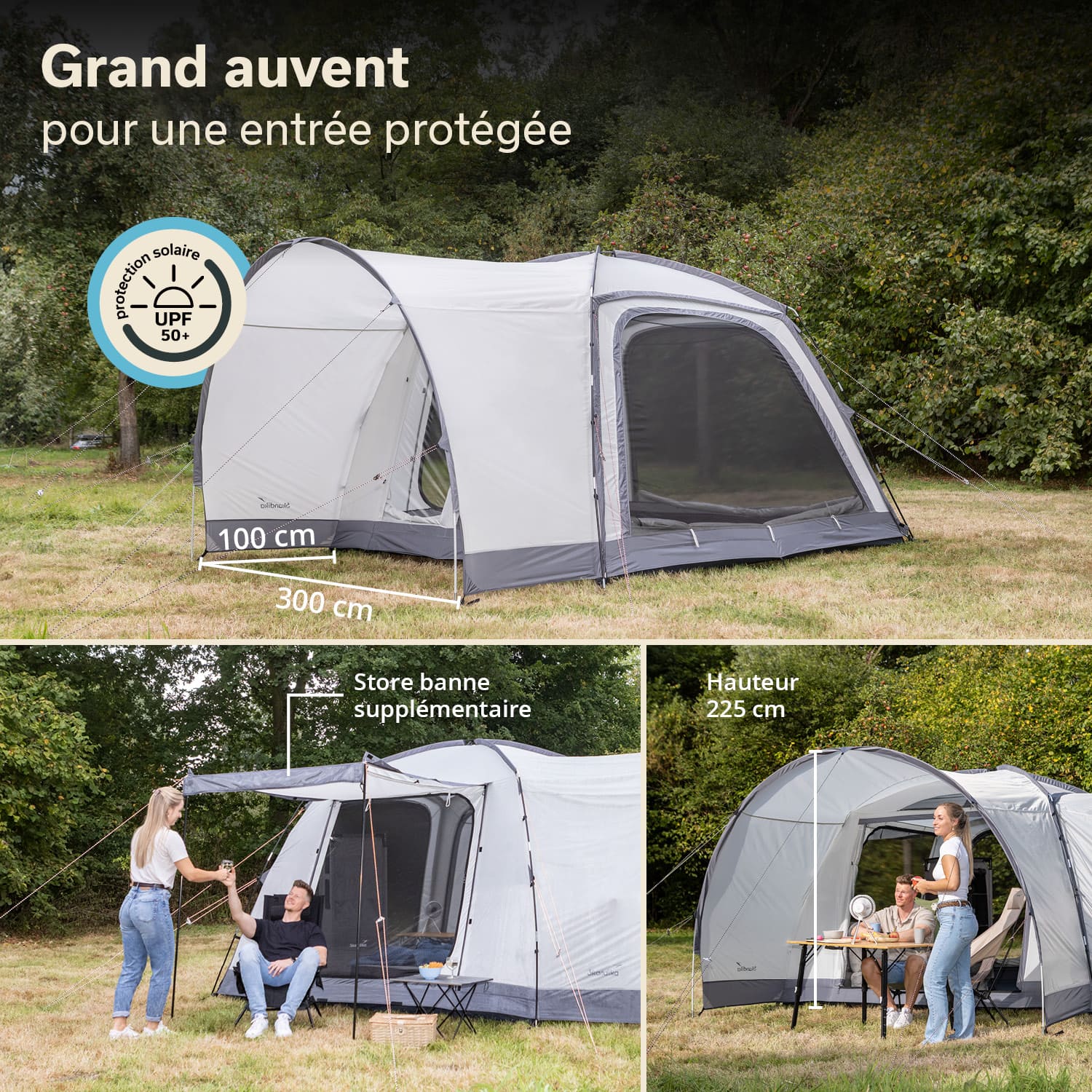 Le grand auvent intégré avec parois latérales se trouve à l'avant de la tente. Il protège du soleil, du vent et des regards indiscrets – idéal comme refuge à l'abri des intempéries ou comme espace de rangement supplémentaire dans l'entrée.