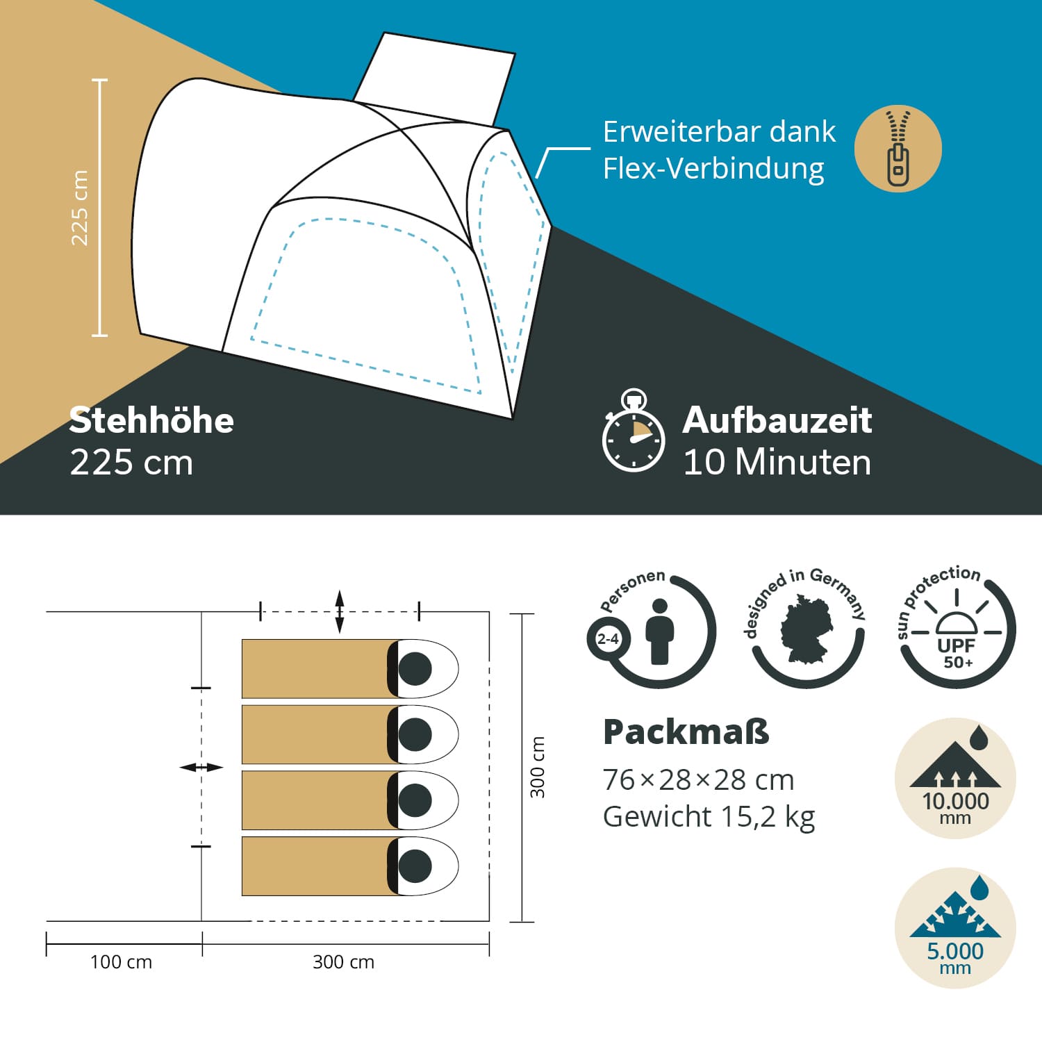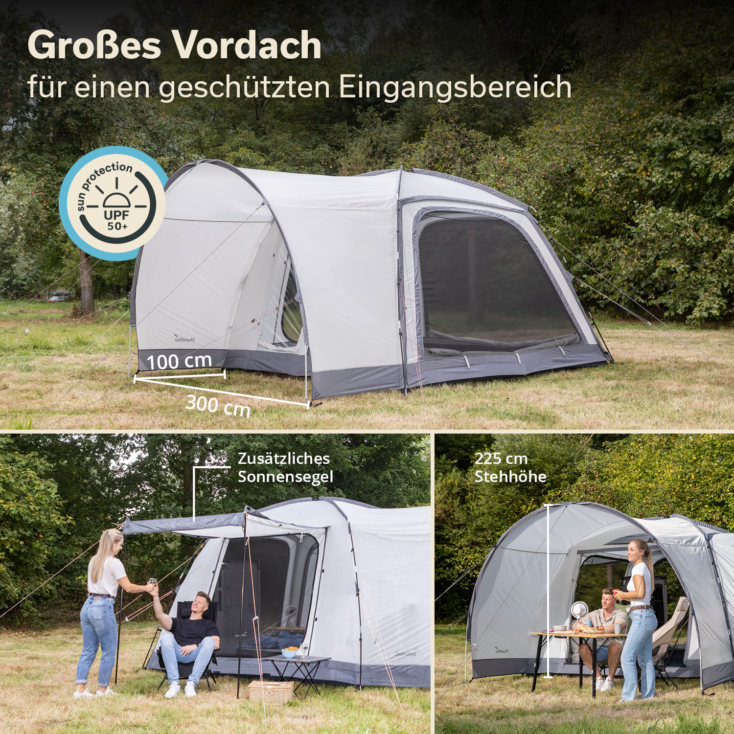 Le tissu de la tente dispose d'un indice de protection UV 50+ et empêche la tente de devenir cassante ou de se fissurer sous l'effet d'un ensoleillement intense. La tente est plus durable, ne chauffe pas aussi rapidement et favorise un climat intérieur agréable.