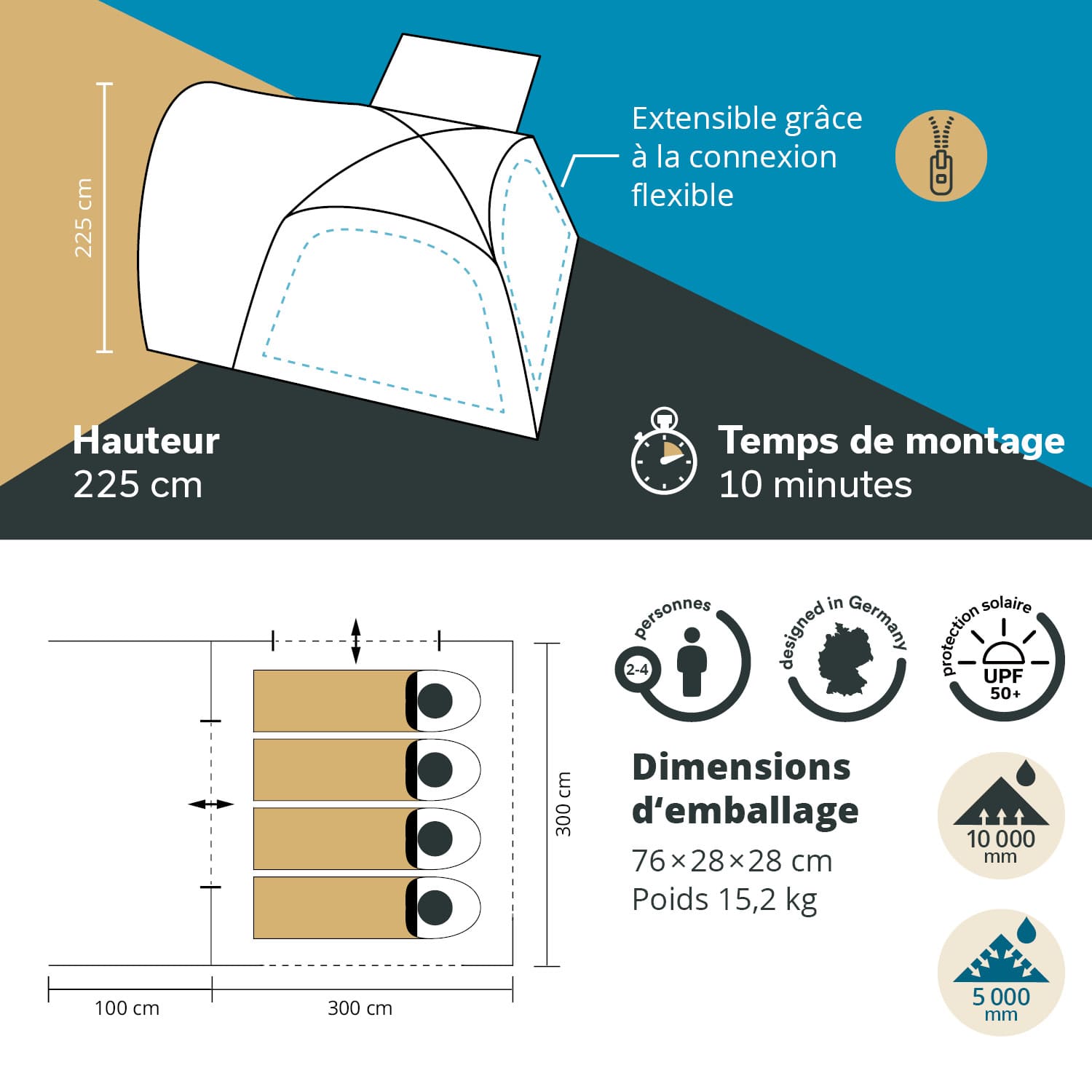 - Dimensions : 300 × 300 + 100 cm / Hauteur : 225 cm / Dimensions emballé : 76 × 28 × 28 cm / Poids : 15,2 kg