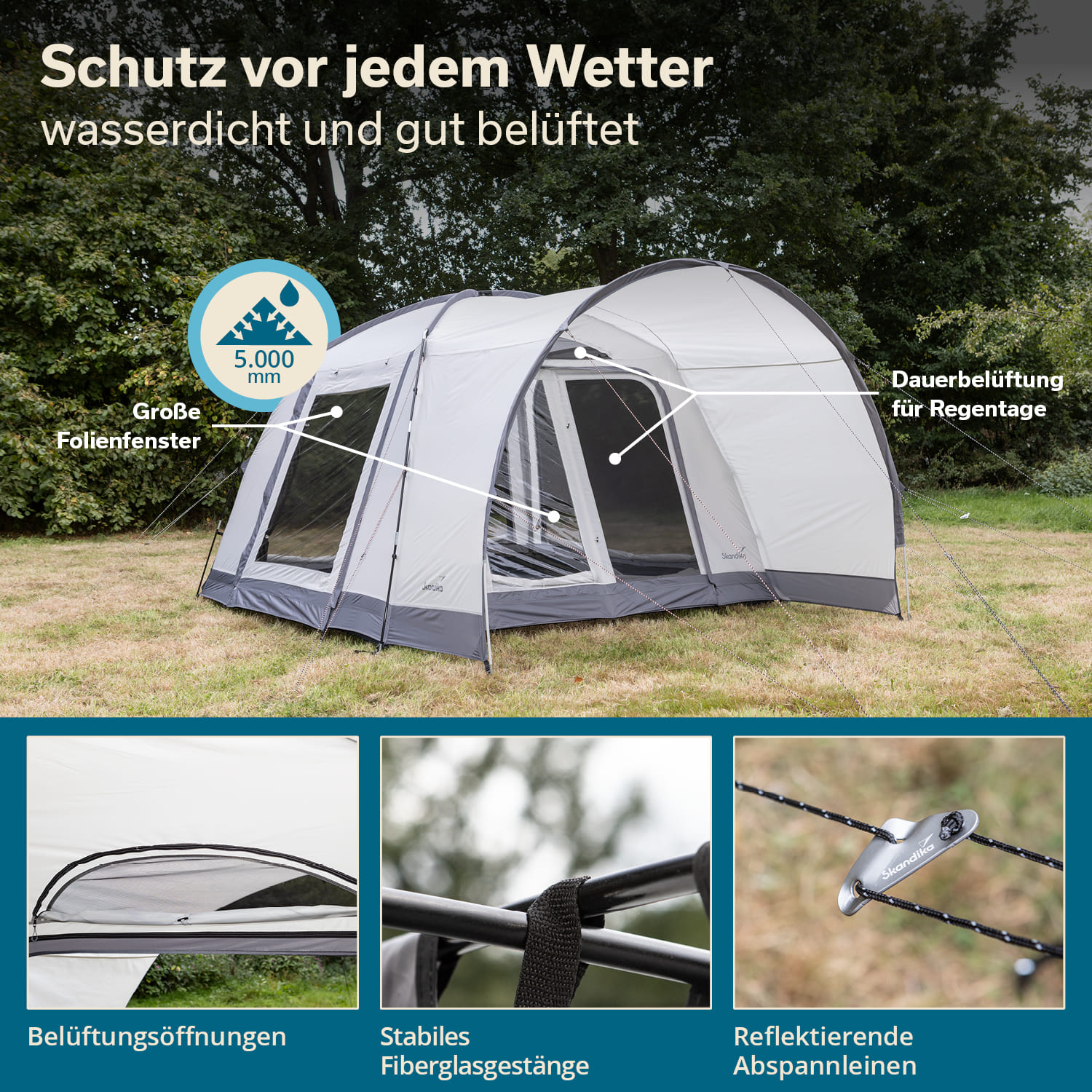 Grâce à son tissu robuste avec une colonne d'eau élevée de 5 000 mm et ses coutures soigneusement scellées, la Pitea 4 Flex Protect est totalement imperméable. Son armature stable en fibre de verre incassable résiste même aux vents violents.
