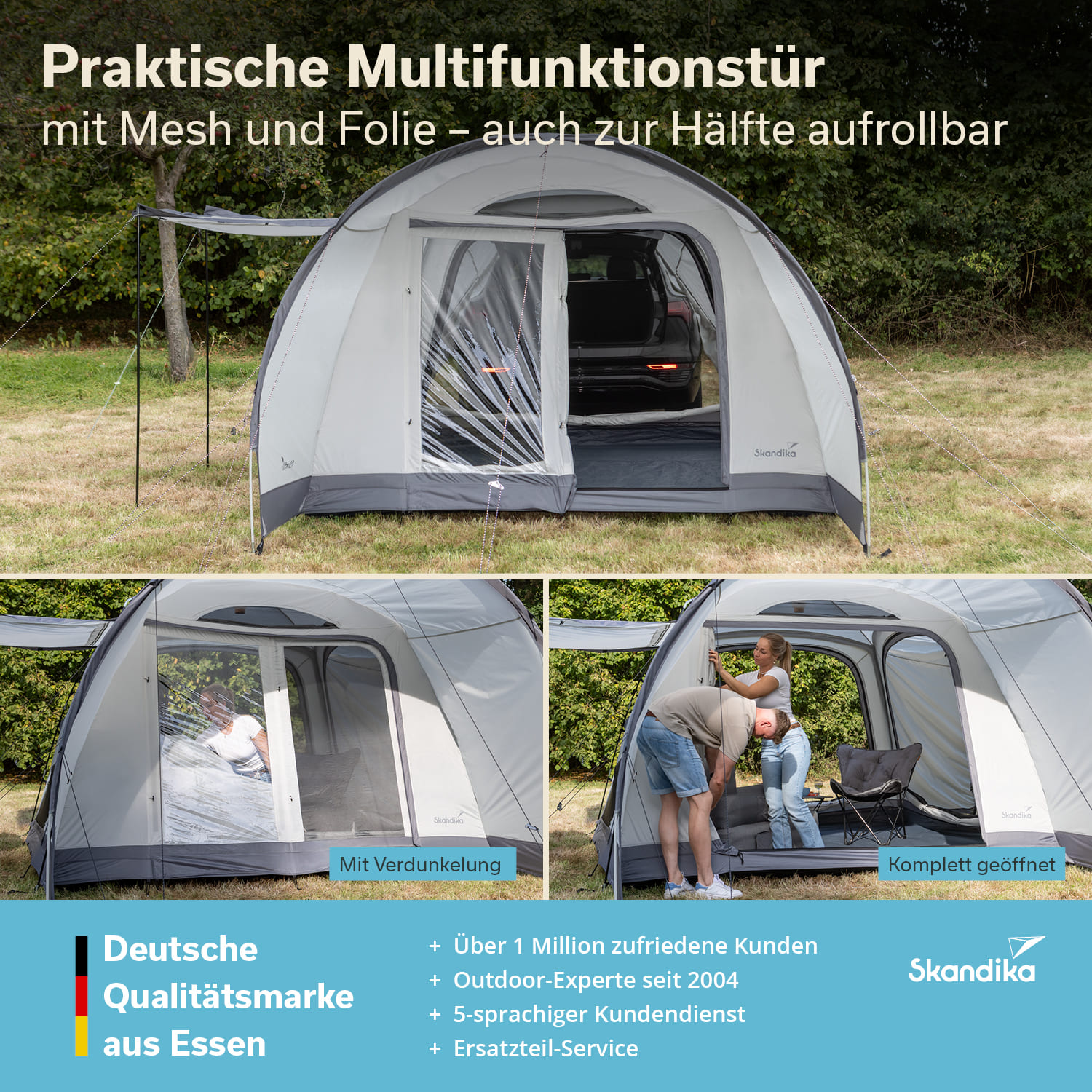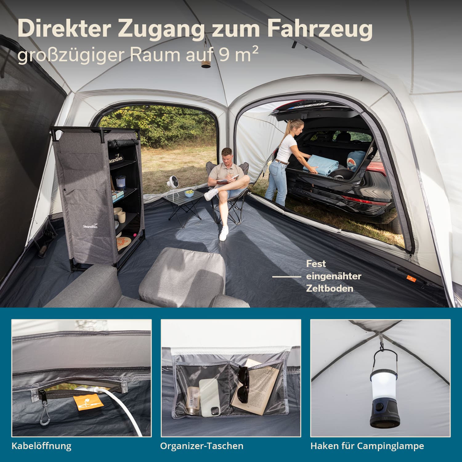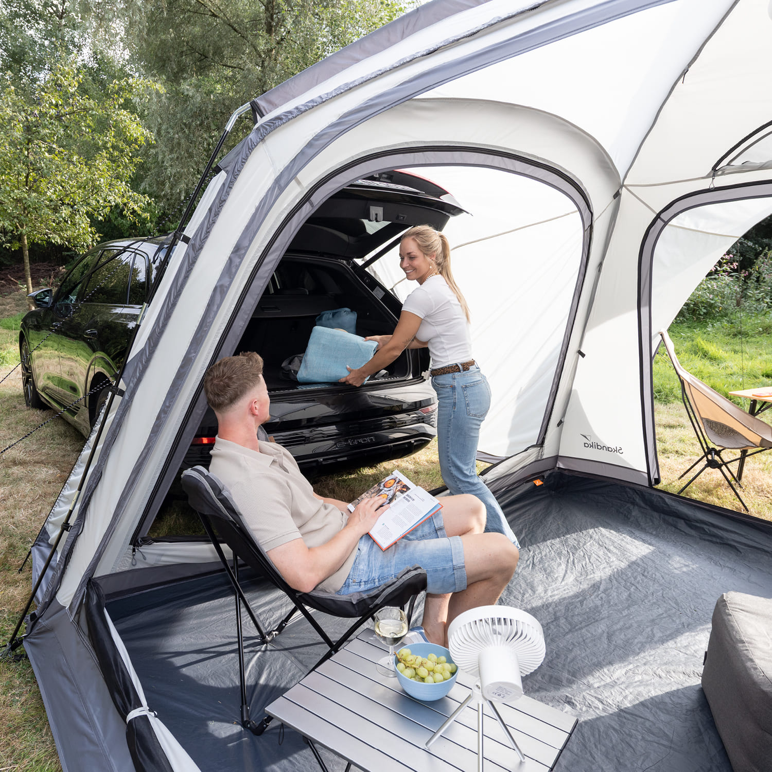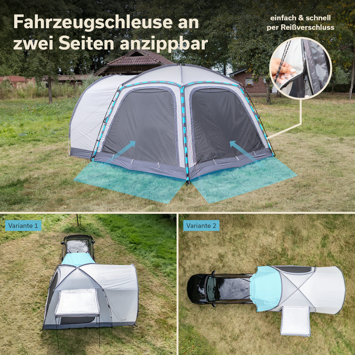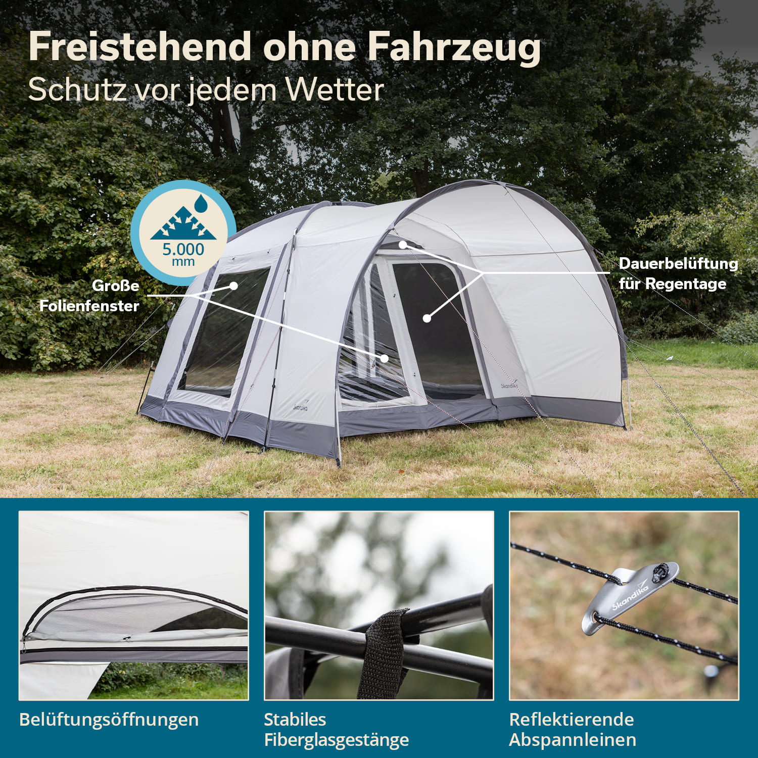 La tente peut également être montée de manière autonome, et la voiture reste utilisable de manière flexible malgré le sas : il suffit de la détacher, de partir, puis de la rattacher. Parfait pour les excursions d'une journée pendant les vacances en camping.