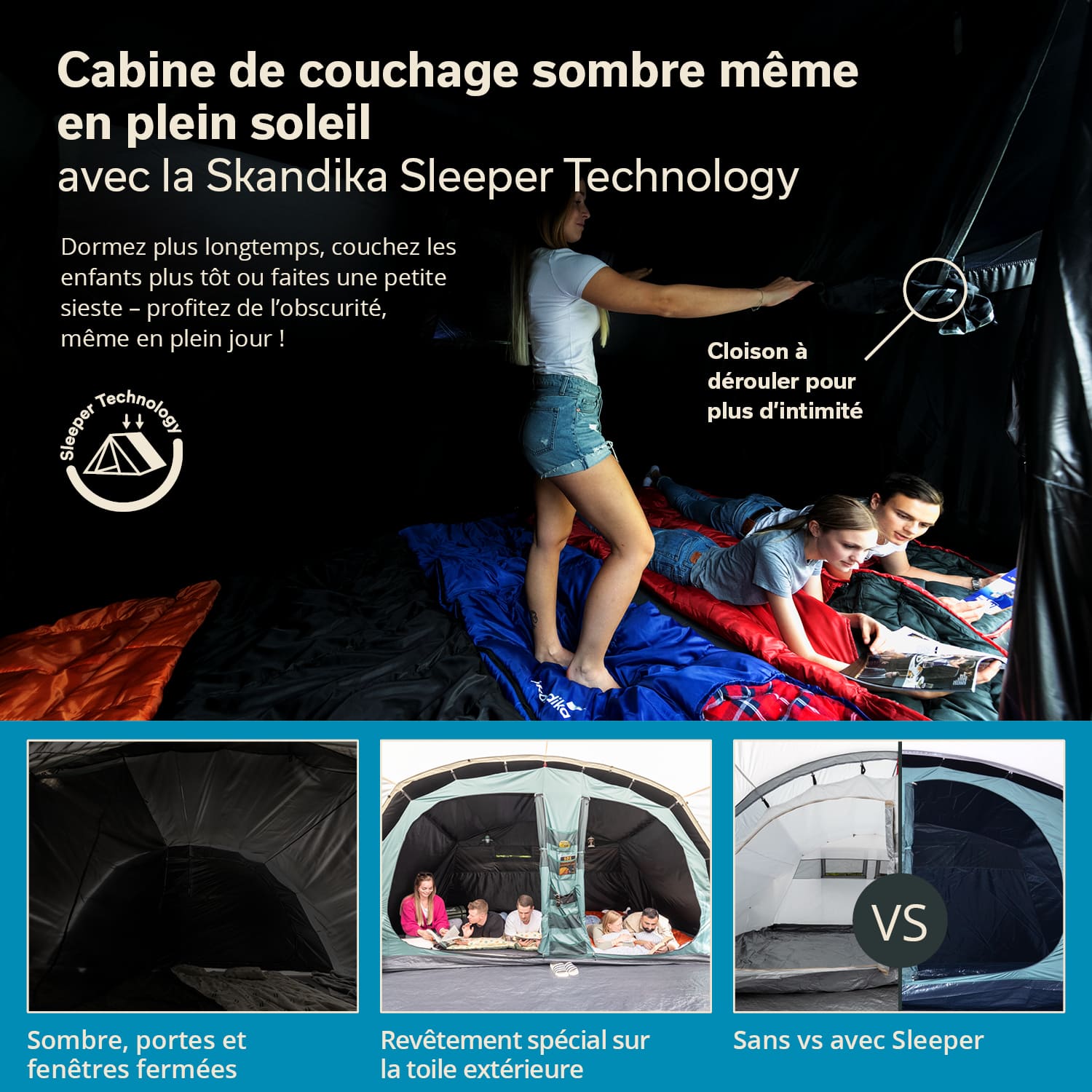 Si nécessaire, la cabine sombre peut être divisée par une cloison enroulable afin de créer deux zones de couchage séparées. Pour plus de flexibilité, les deux portes de la cabine sont composées d'une couche de moustiquaire et d'une couche de toile de tente opaque, pour garantir une bonne circulation de l'air et une certaine intimité.