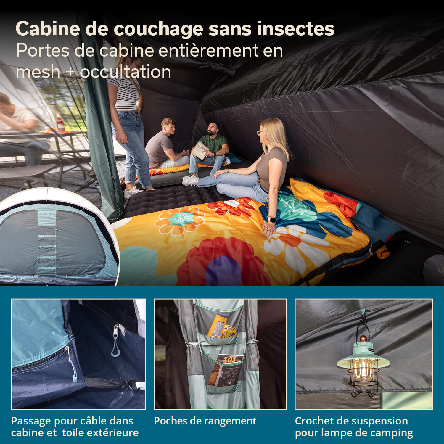 - Avec poches de rangement, passage pour câbles protégé, crochet de suspension pour lampe de camping, sac de transport