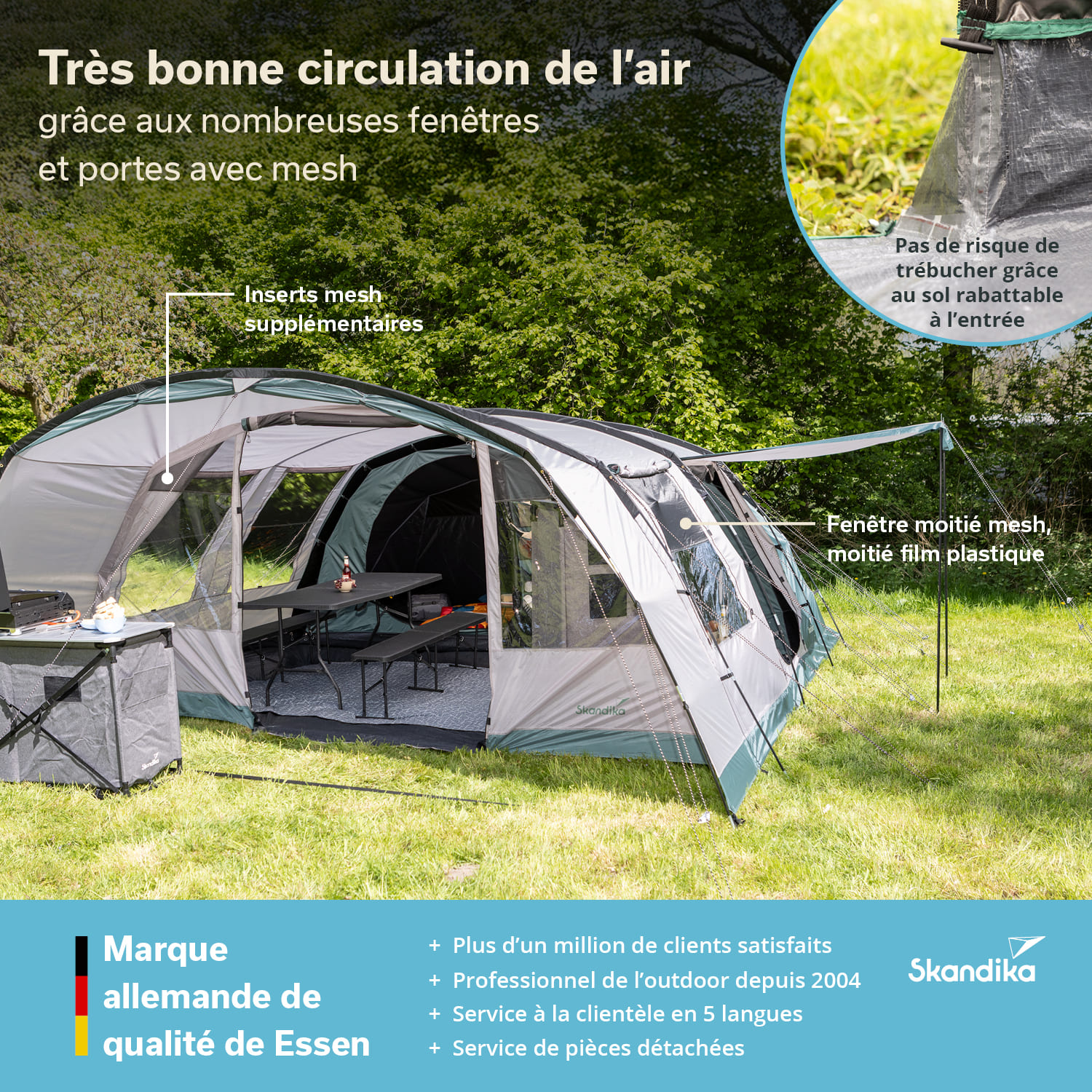De grandes fenêtres panoramiques dans la paroi frontale assurent un climat agréable dans la tente. Elles sont composées d'un film transparent et disposent dans la partie supérieure d'inserts de moustiquaires pour une arrivée d'air frais optimale. Elles sont en outre équipées de stores occultants.