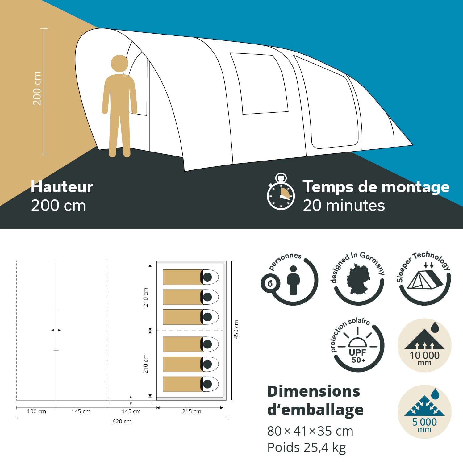 Tente tunnel spacieuse pour 6 personnes avec un séjour encore plus grand pour un petit plus de confort. Montée en un clin d'œil et avec une hauteur confortable de 200 cm, la tente permet de vivre de superbes aventures en plein air pour les familles avec enfants ou les groupes d'amis.