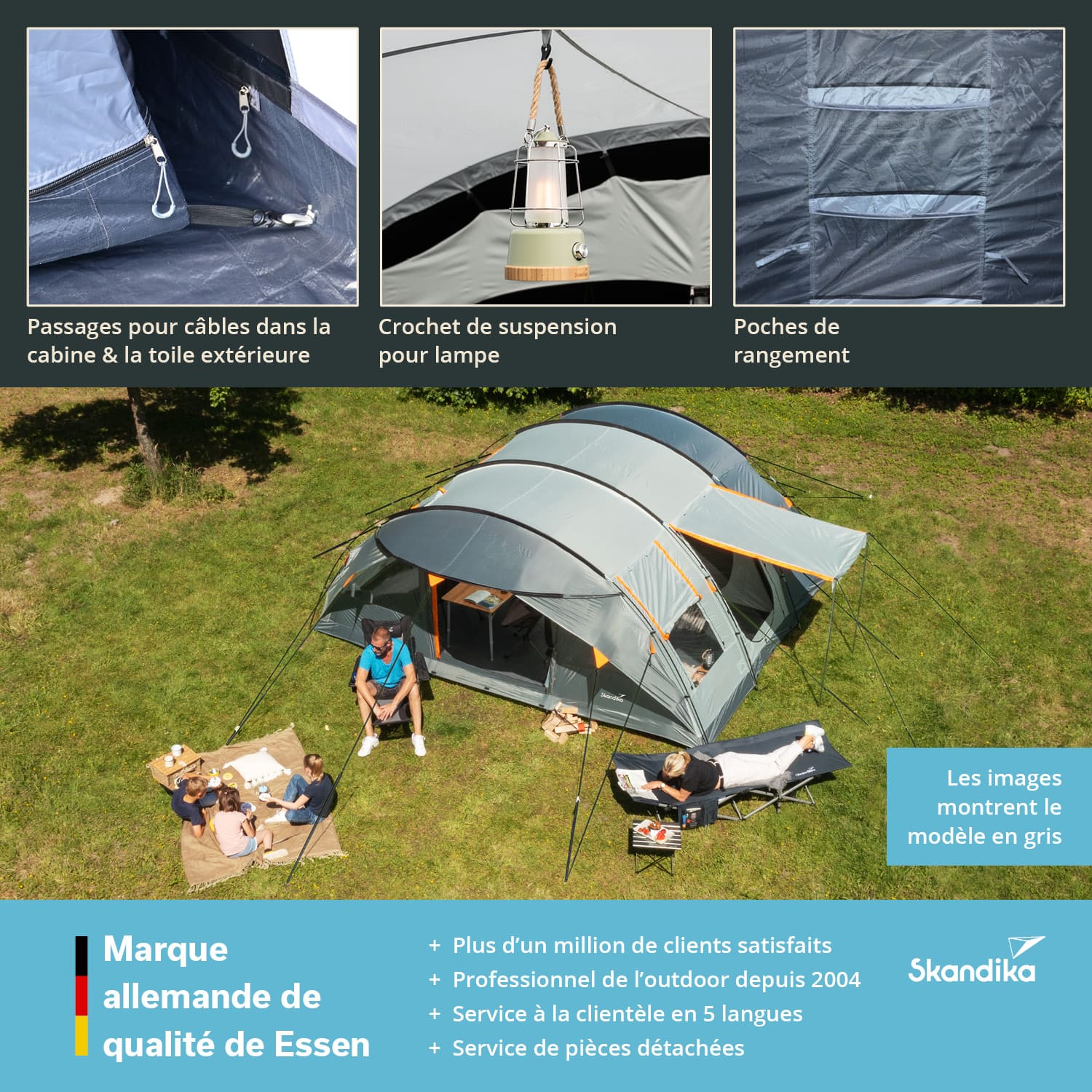 • Avec poches d'organisation, ouverture protégée pour le câble, crochet pour lampe de camping, sac de transport