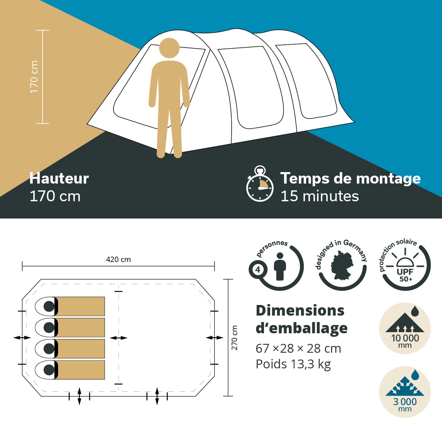 - Dimensions : 420 × 275 cm / Cabine : 400 × 255 cm / Poids : 13,3 kg / Dimensions de rangement : 67 × 28 × 28 cm