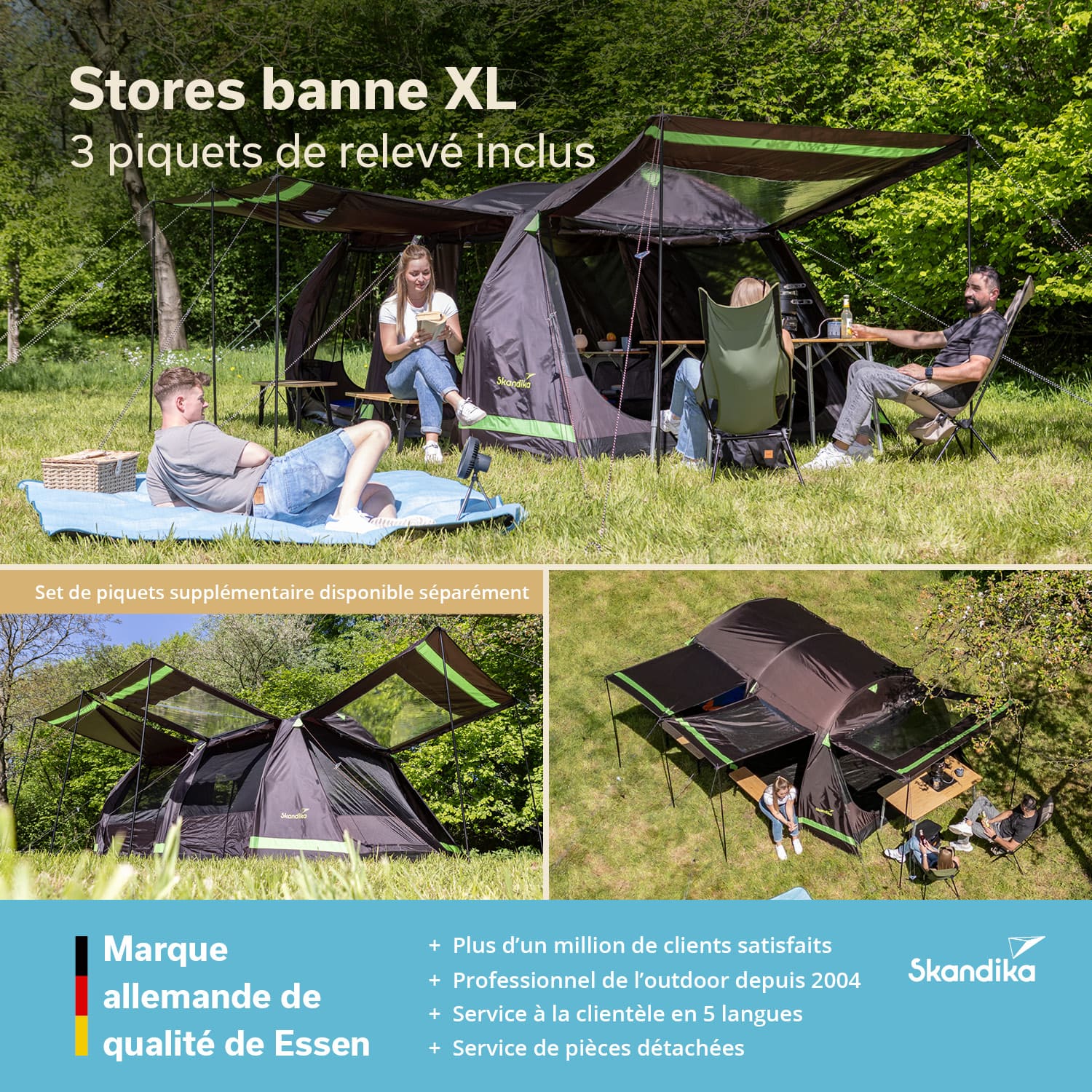 Les quatre entrées au total constituent une particularité qui assure une flexibilité maximale et une multitude de possibilités d'aération. Toutes les portes peuvent en outre être montées en tant que store banne pour offrir une ombre agréable dans l'entrée. Les trois piquets fournis suffisent pour installer les deux portes latérales en même temps. Pour ceux qui souhaitent installer toutes les portes en même temps, des piquets supplémentaires peuvent être achetées séparément dans la boutique Skandika.