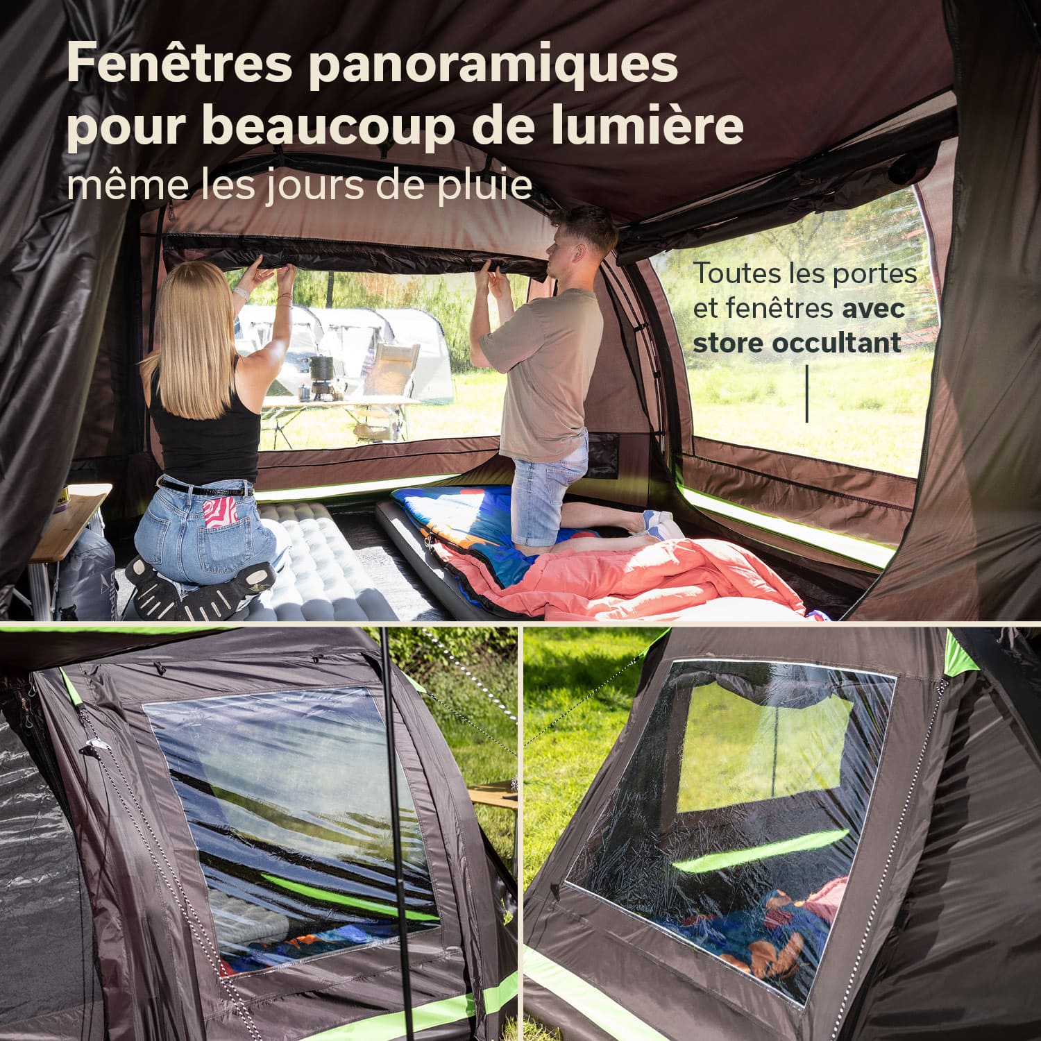 La tente convainc par ses deux grandes fenêtres panoramiques en film plastique intégrées dans la tente extérieure - l'une sur la porte avant et l'autre sur la porte latérale avant. Même par mauvais temps, elles assurent un intérieur lumineux malgré la fermeture des portes. Des stores occultants intérieurs permettent d'avoir plus d'intimité si nécessaire. Les deux fenêtres latérales peuvent être occultées de l'extérieur pour les protéger du vent et des intempéries.