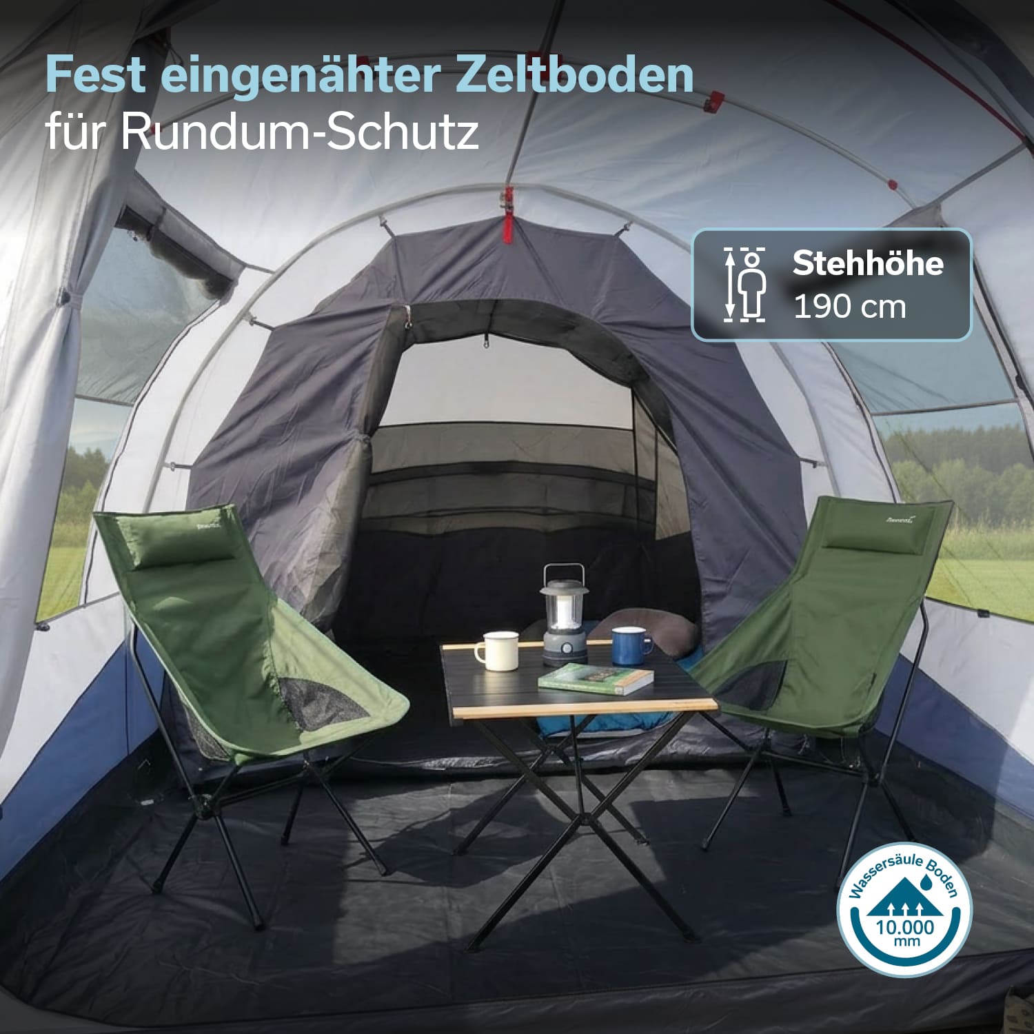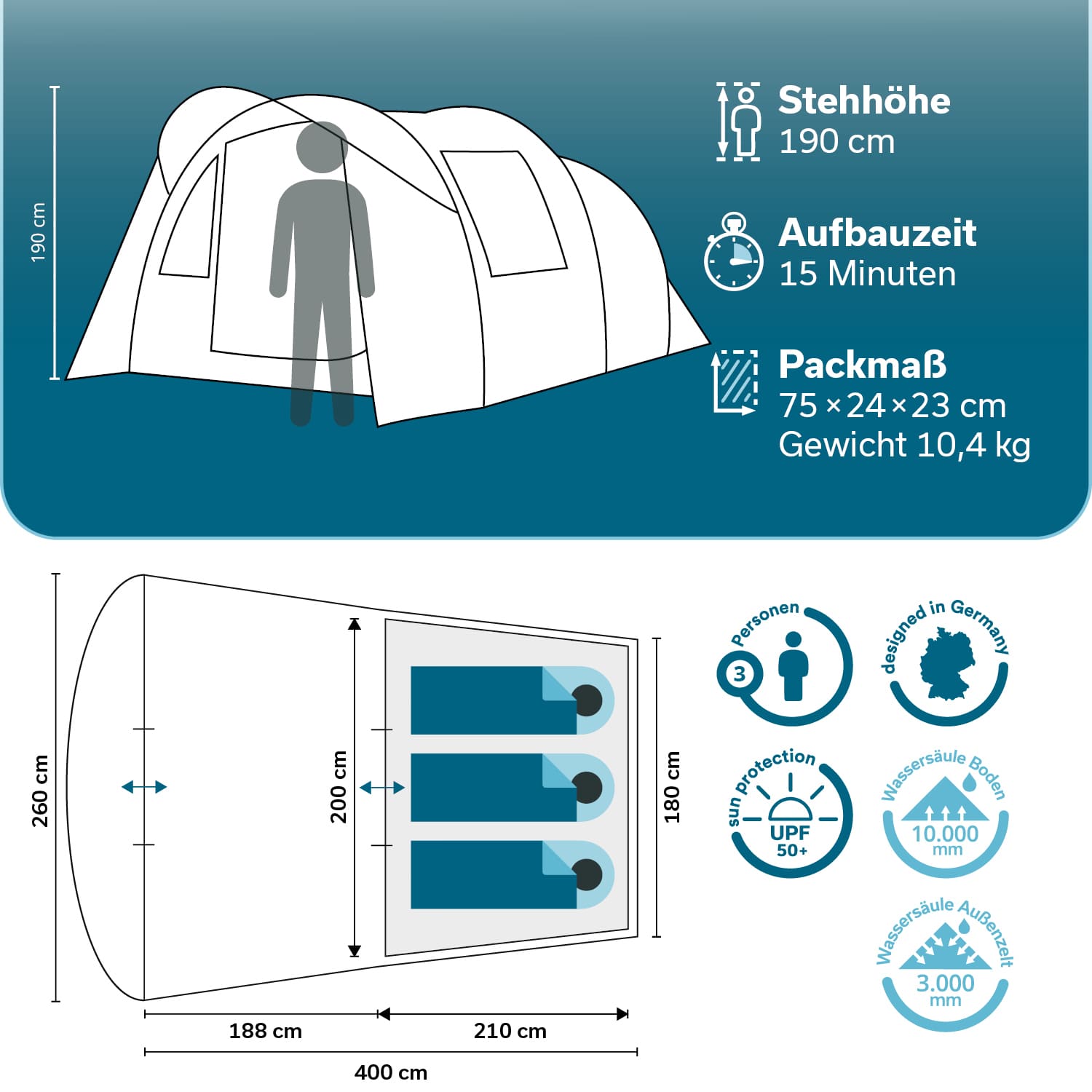 - Tente tunnel pour 3 personnes avec une hauteur de 190 cm et un séjour spacieux
