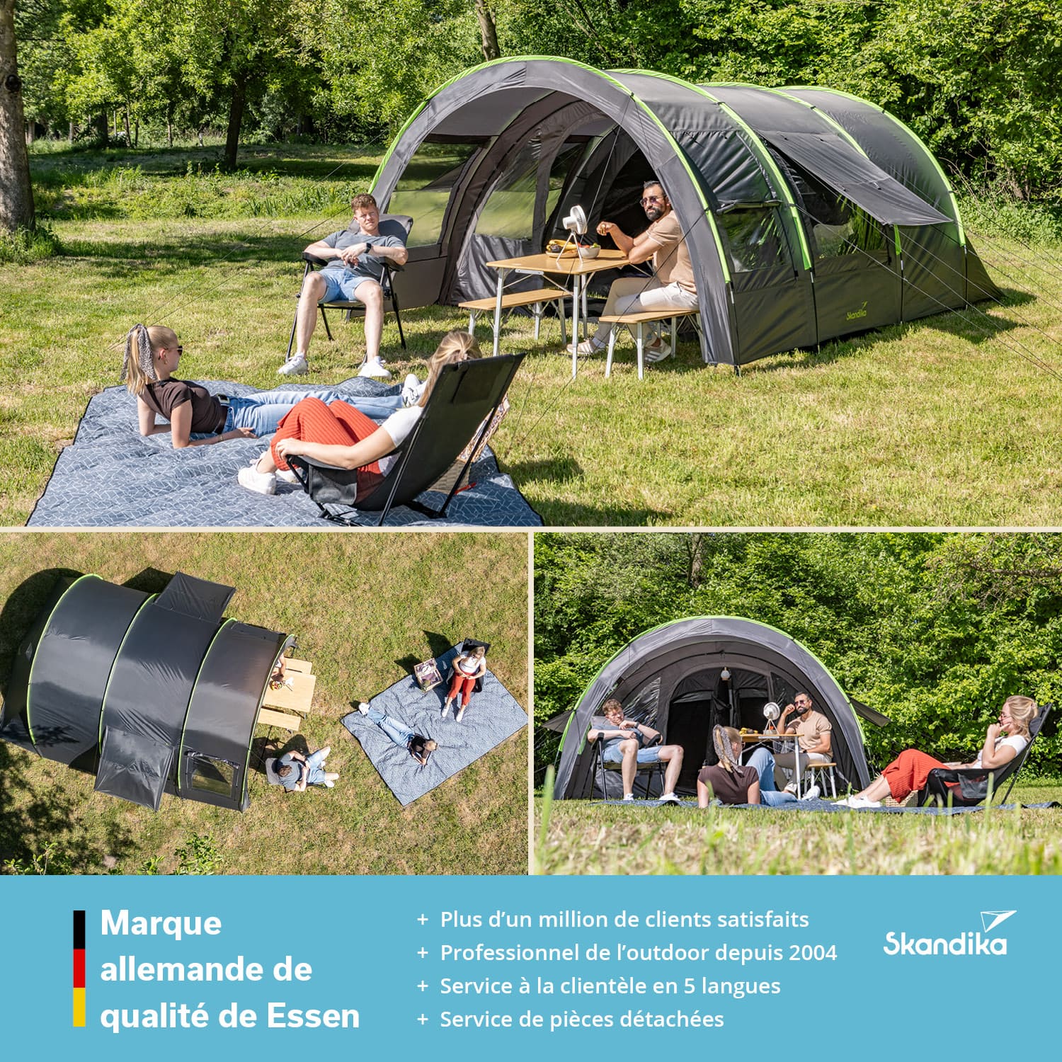 - Dimensions : 480 × 340 cm / Cabines : 140 × 210 cm chacune / Dimensions de rangement : 70 × 28 × 22 cm / Poids : 12 kg