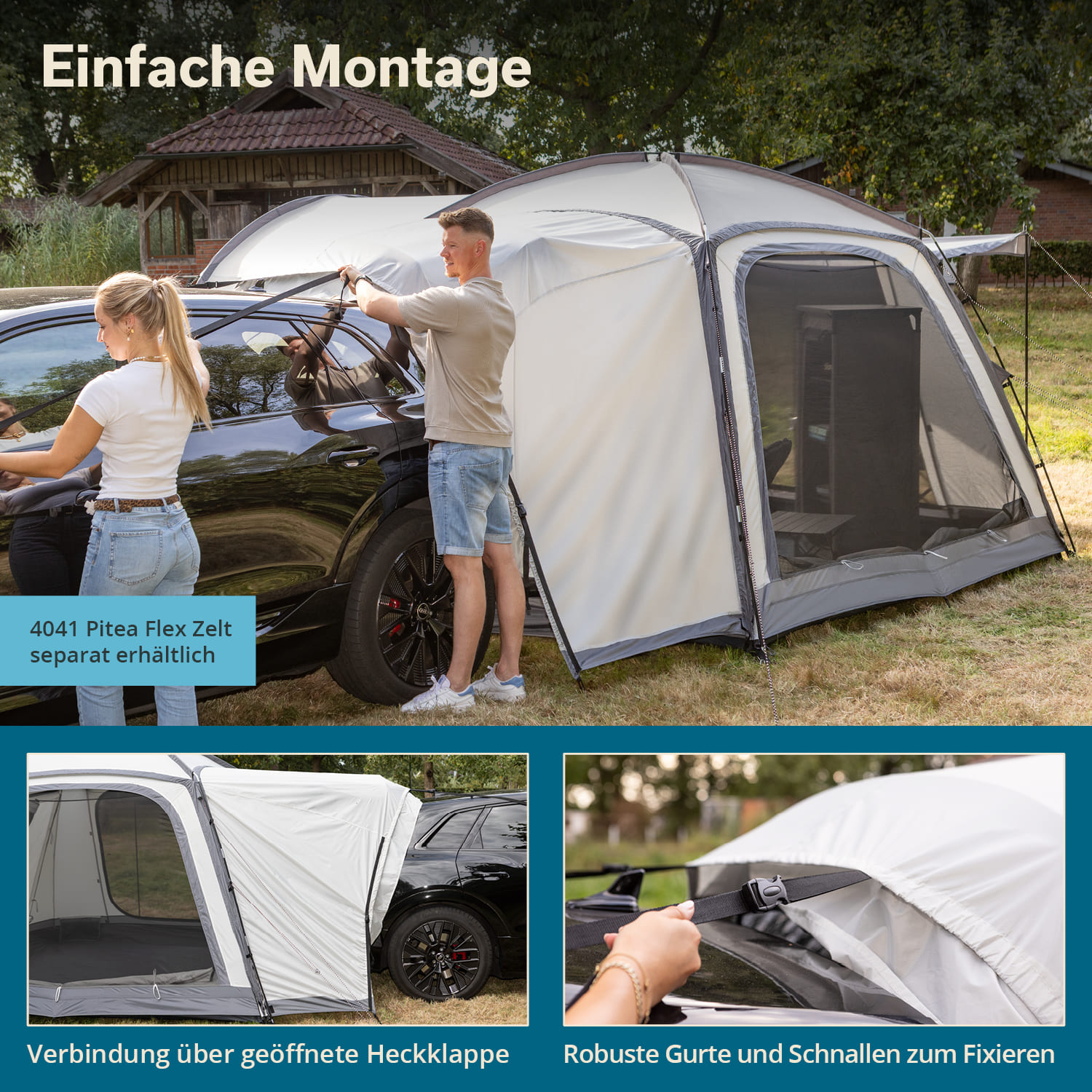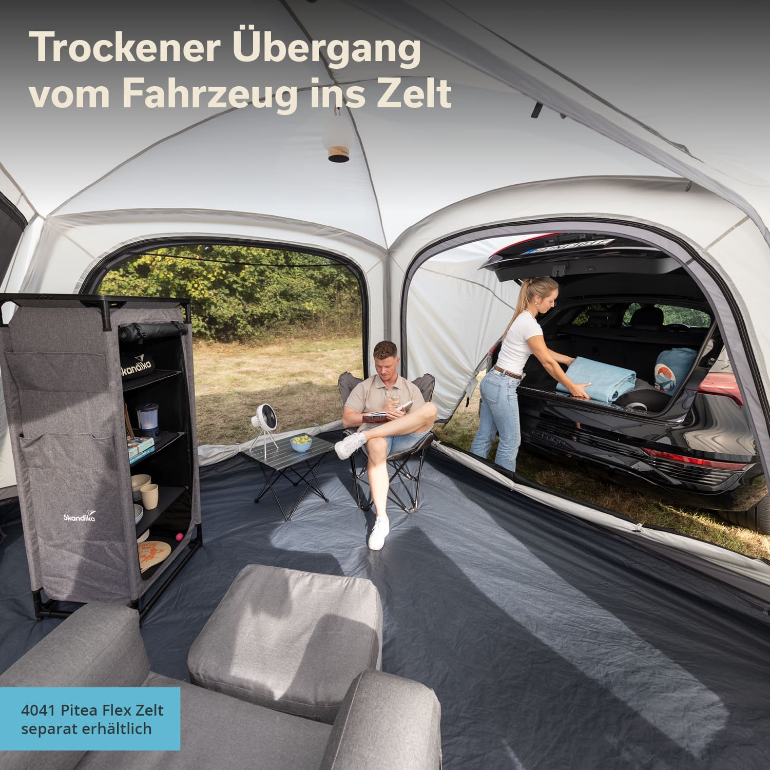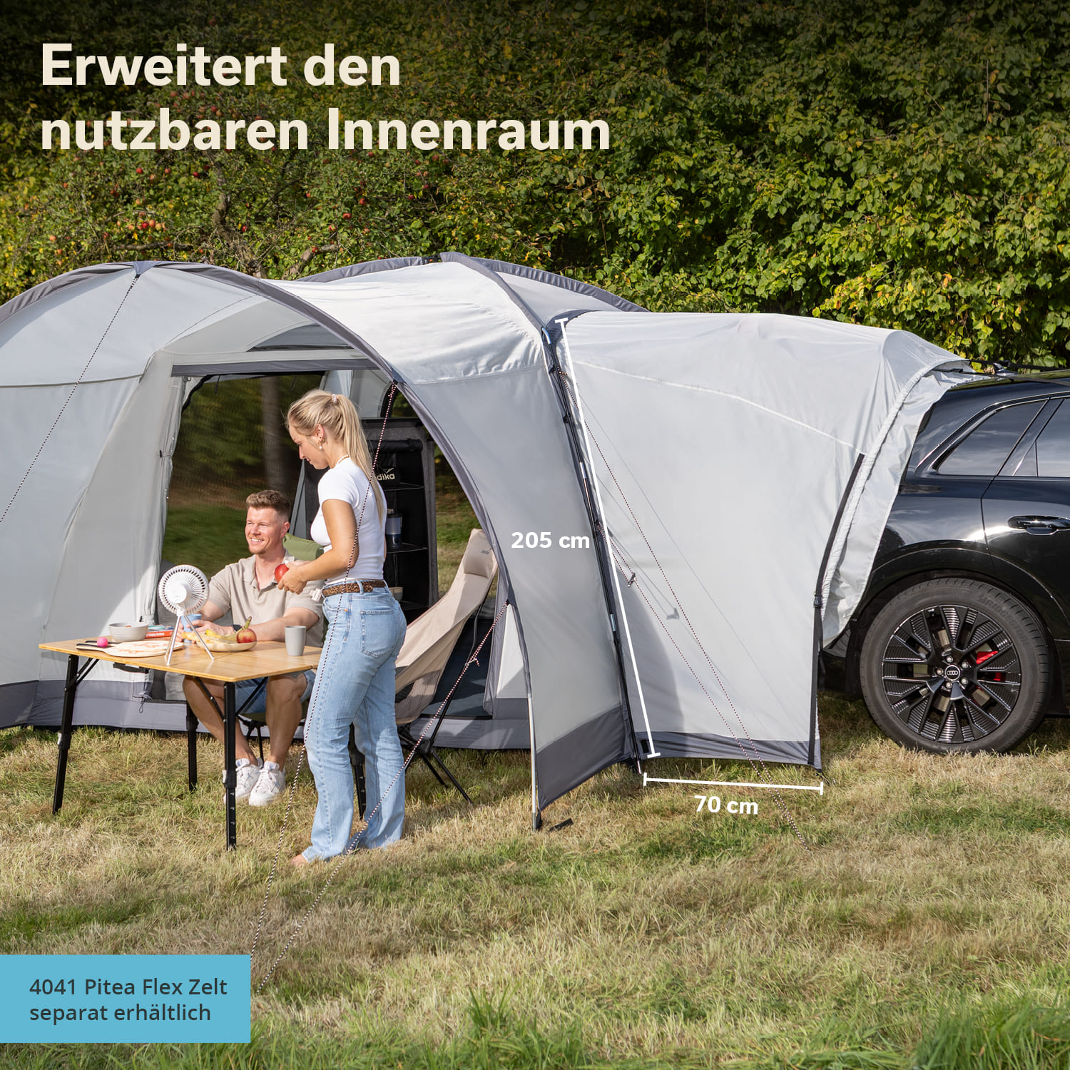 Ce sas pratique pour le hayon d'un SUV fait partie de notre système modulaire Pitea Flex, qui offre une flexibilité maximale et s'adapte à toutes les situations de camping grâce à des extensions.