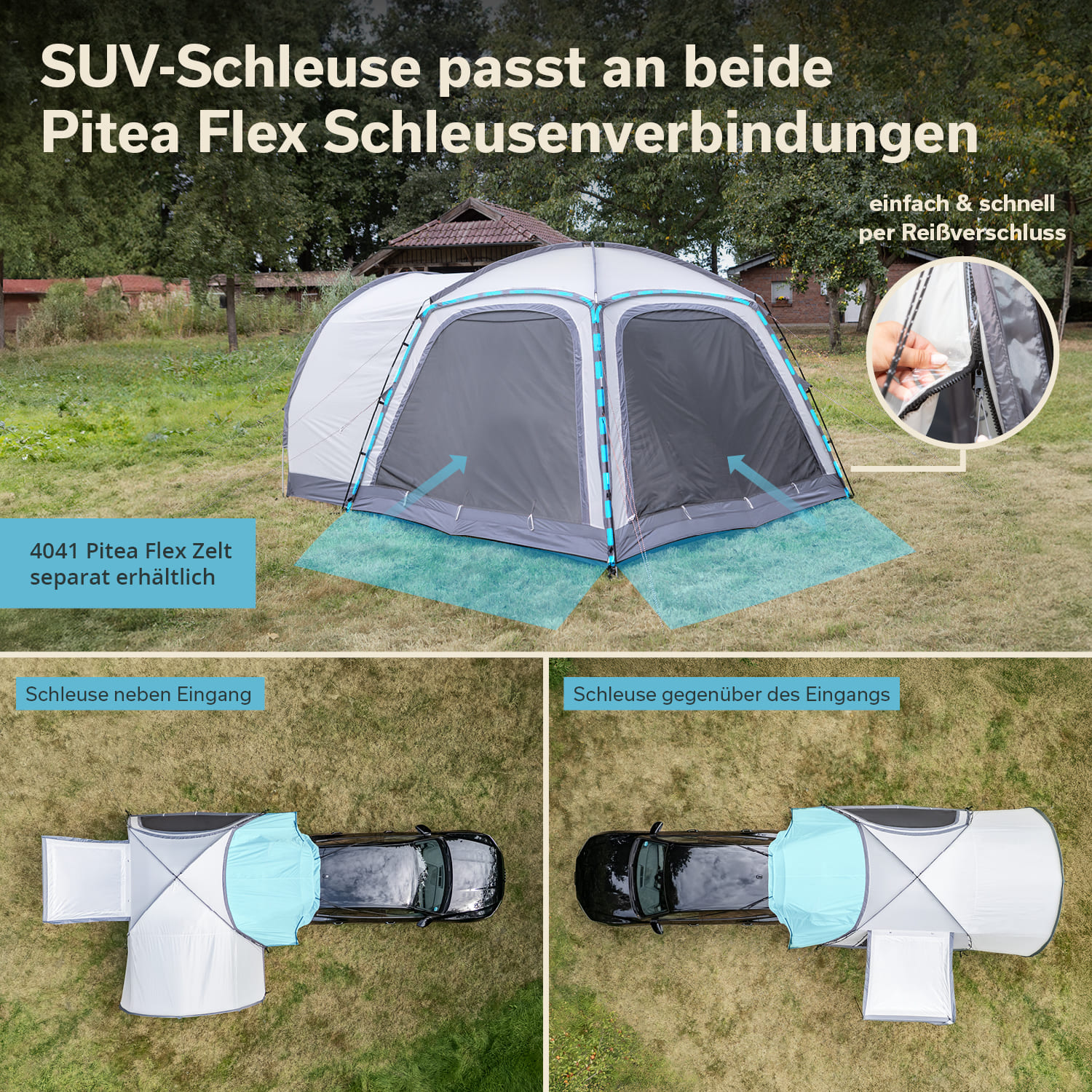 - Fixation à la tente à l'aide de fermetures à glissière robustes et résistantes aux intempéries