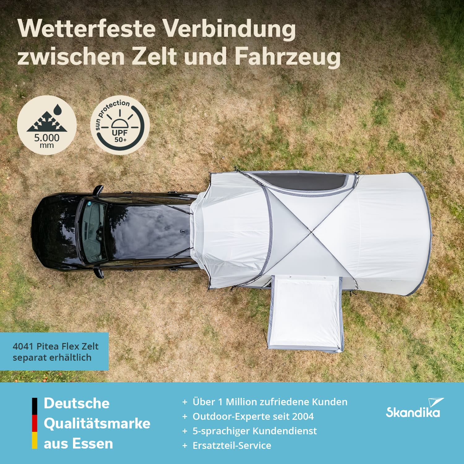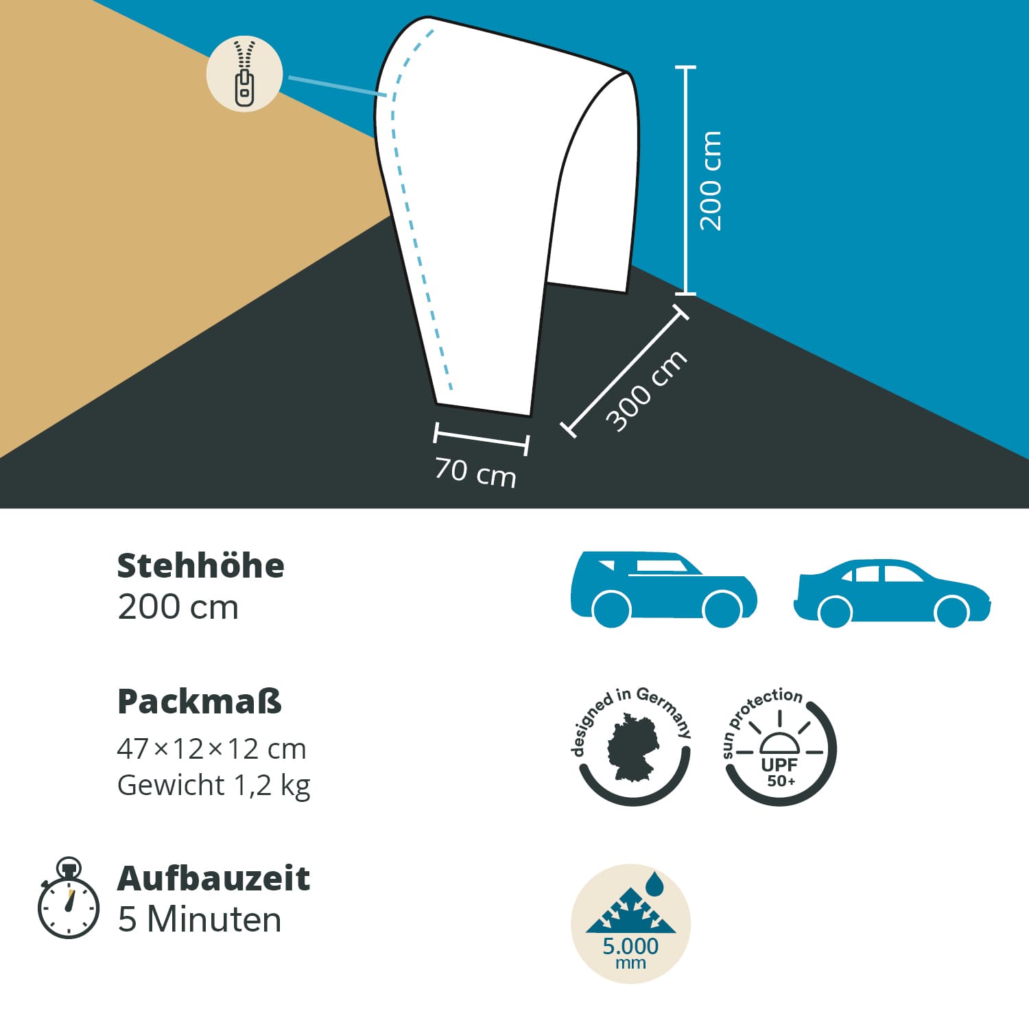 Avec une colonne d'eau de 5 000 mm et un indice de protection UV 50+, ce sas offre une protection fiable par tous les temps – il est tout aussi robuste que la tente qui va avec.