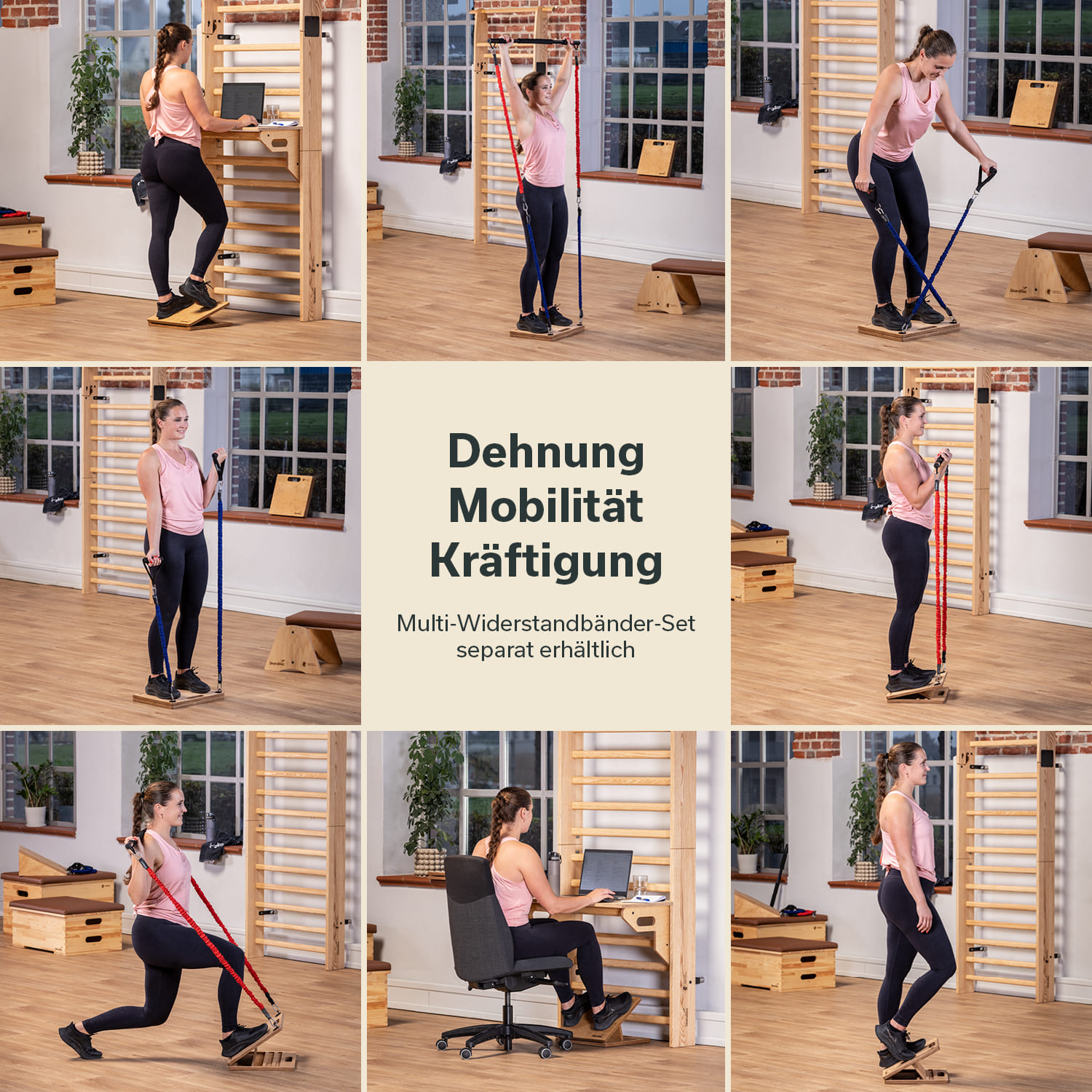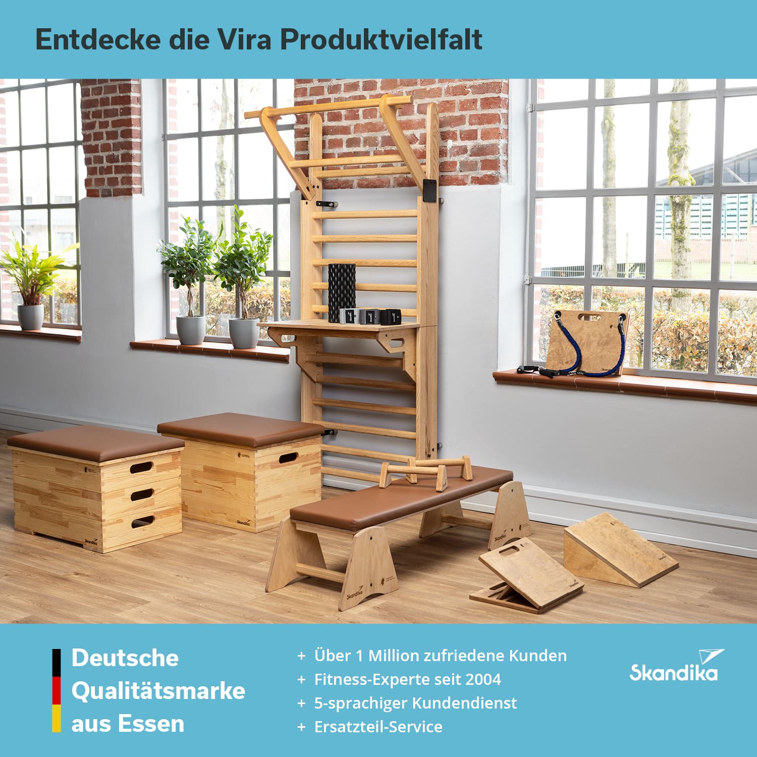 Pour encore plus de possibilités d'entraînement, l'appareil d'étirement des mollets peut être complété par d'autres produits de la gamme Skandika Vira, tels que l'espalier Vira ou la caisse de saut Vira. Cela permet un entraînement flexible et varié.