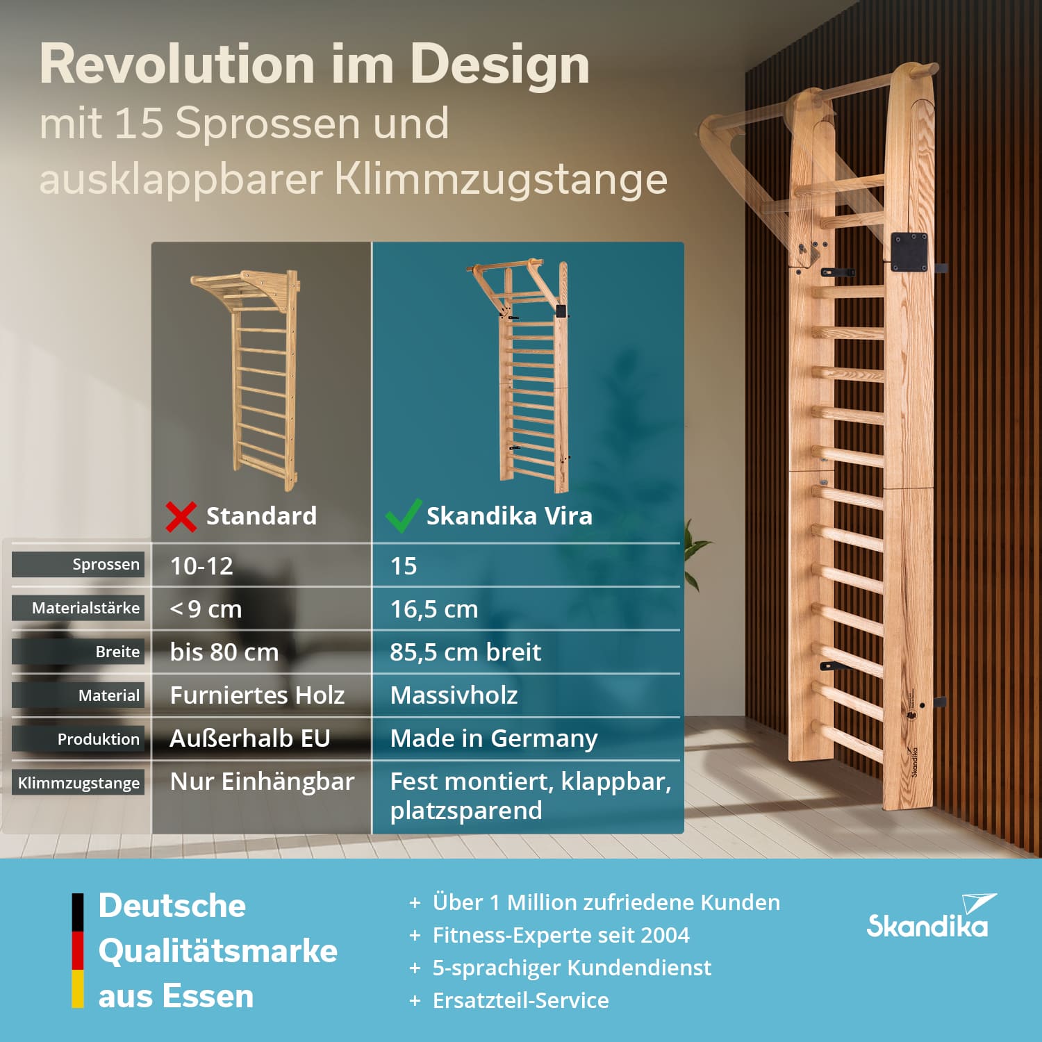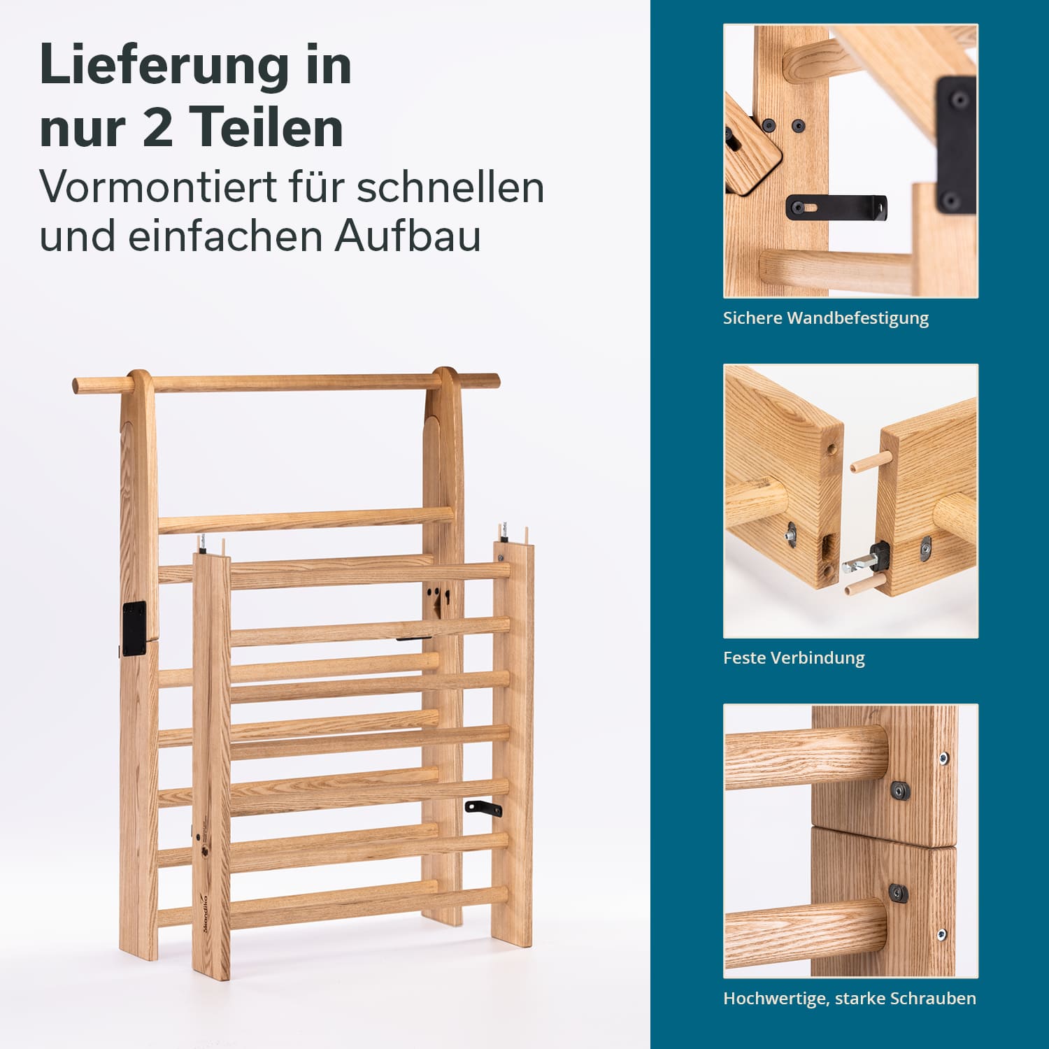 Contrairement aux appareils conventionnels, l'espalier Vira dispose de 15 barreaux espacés de manière optimale de 9 cm chacun. Lorsque la barre de traction n'est pas utilisée, elle peut être repliée pour gagner de la place.