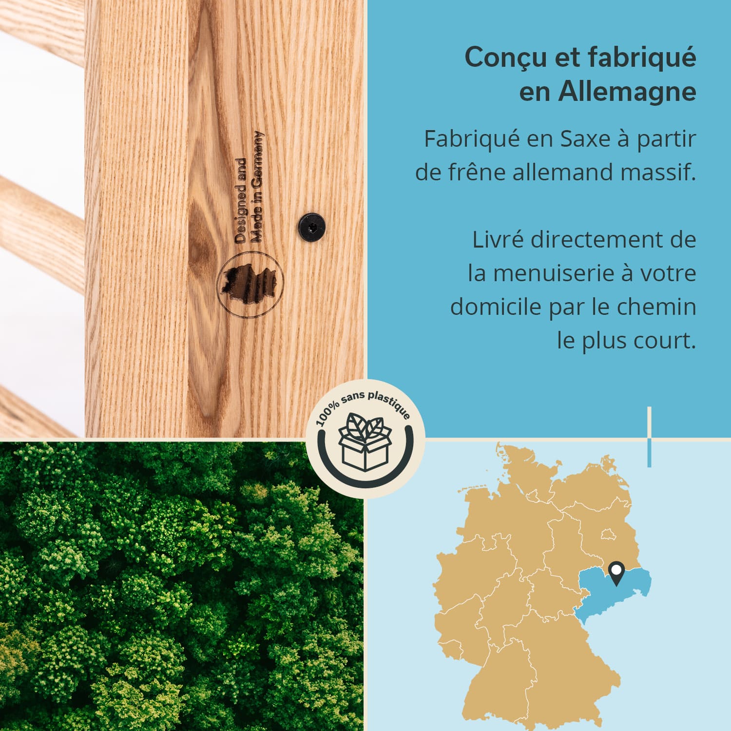 • Fabriqué dans une menuiserie allemande à partir de bois de frêne issu de la sylviculture régionale