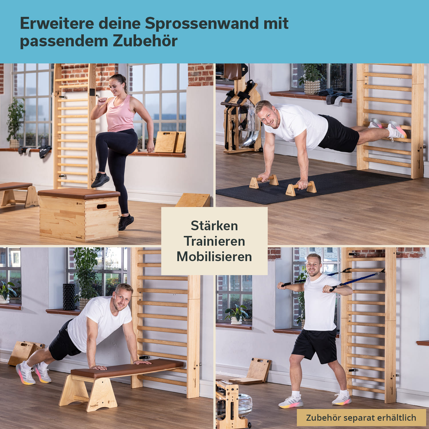 Pour encore plus de possibilités d'entraînement, l'espalier peut être complété par d'autres produits de la gamme Skandika Vira, par exemple le banc de musculation Vira. Cela permet un entraînement flexible et varié.