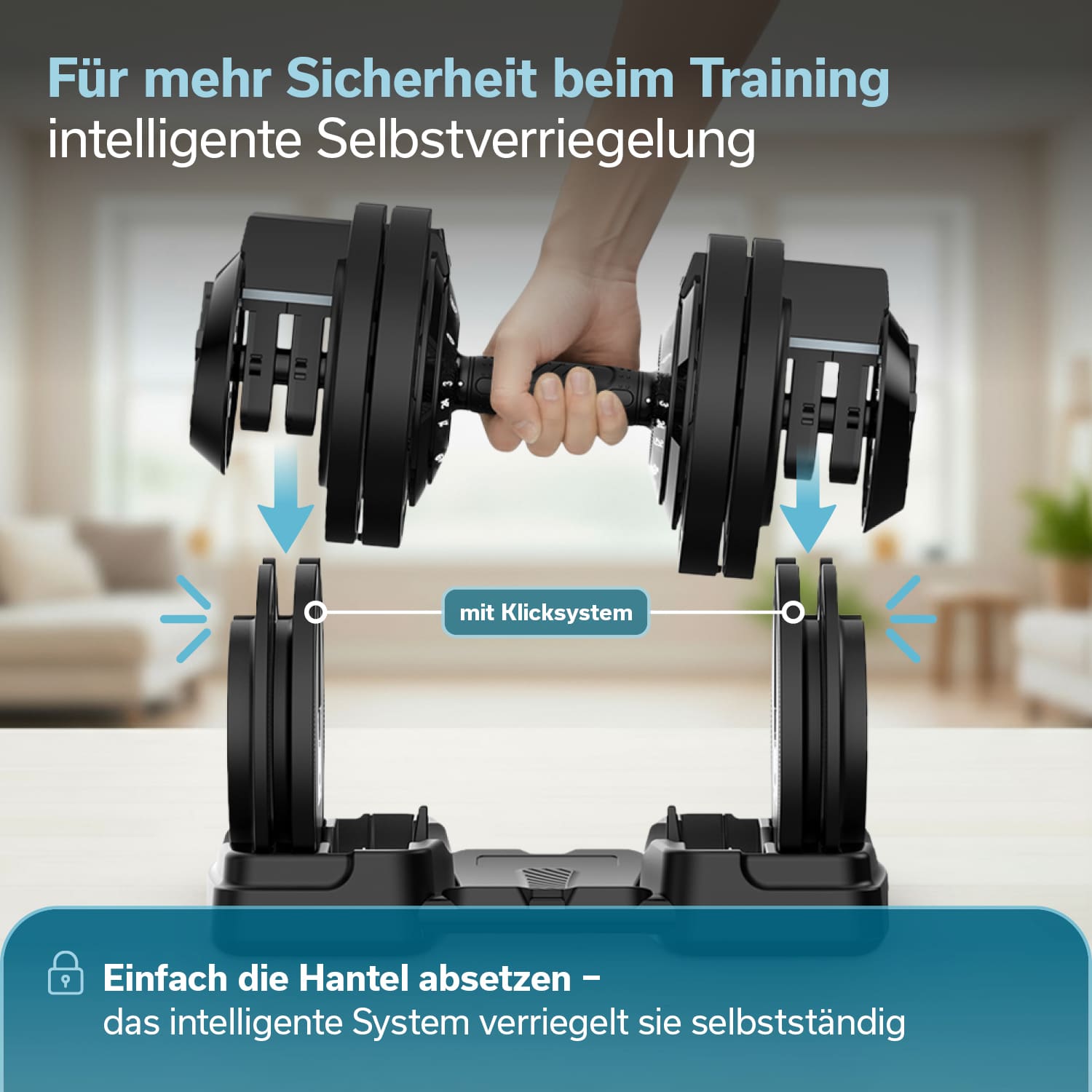 Le système innovant de verrouillage automatique permet de changer le poids en quelques secondes. Il suffit de positionner l'haltère sur le support, de régler le poids souhaité à l'aide de la poignée rotative et les disques correspondants s'enclenchent automatiquement.