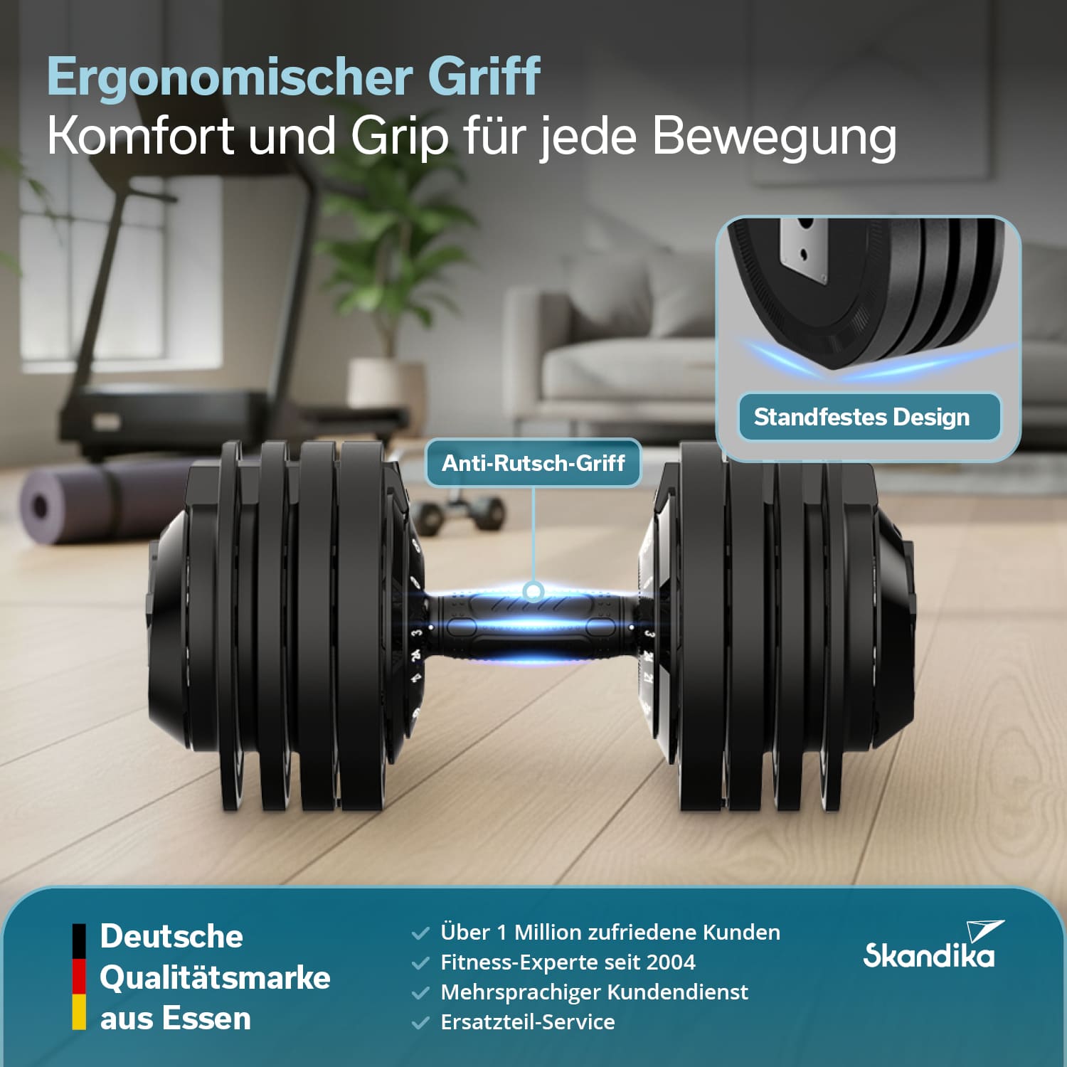 Avec le Skandika Paino, votre salle de sport à domicile s'enrichit d'un haltère réglable qui séduit par son système de changement rapide innovant et son design tout-en-un peu encombrant. Il combine douze niveaux de poids allant de 3 à 24,0 kg dans un seul appareil d'entraînement compact et permet ainsi de nombreux exercices pour les débutants comme pour les utilisateurs avancés. Le système intelligent de verrouillage automatique facilite le changement de poids et garantit des entraînements efficaces sans interruptions inutiles.
